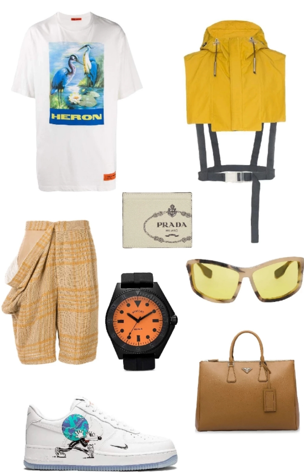 The beauty of summer is that everyday is filled with living life from sunrise to sunset. You can wear this look anytime. Starting with a Heron Preston top featuring a bright printed bird design. Coupled with the Hed Mayner shorts which I found unique because of the cut on the side of the shorts. Pairing it with an artistic pieces such as the Air Force 1 Flyleather OS Nike. I’m drawn to this look because every picture can represent something different. When picking a layering piece I found A COLD WALL light weight vest. This look is full of bright summer colors. I also added the Bamford Mayfair orange faced watch with yellow Burberry frame glasses. The final accessory features a classic piece from Master Piece that represents simplificity with a Prada wallet. This look reminds me of fun in the sun with a casual twist.