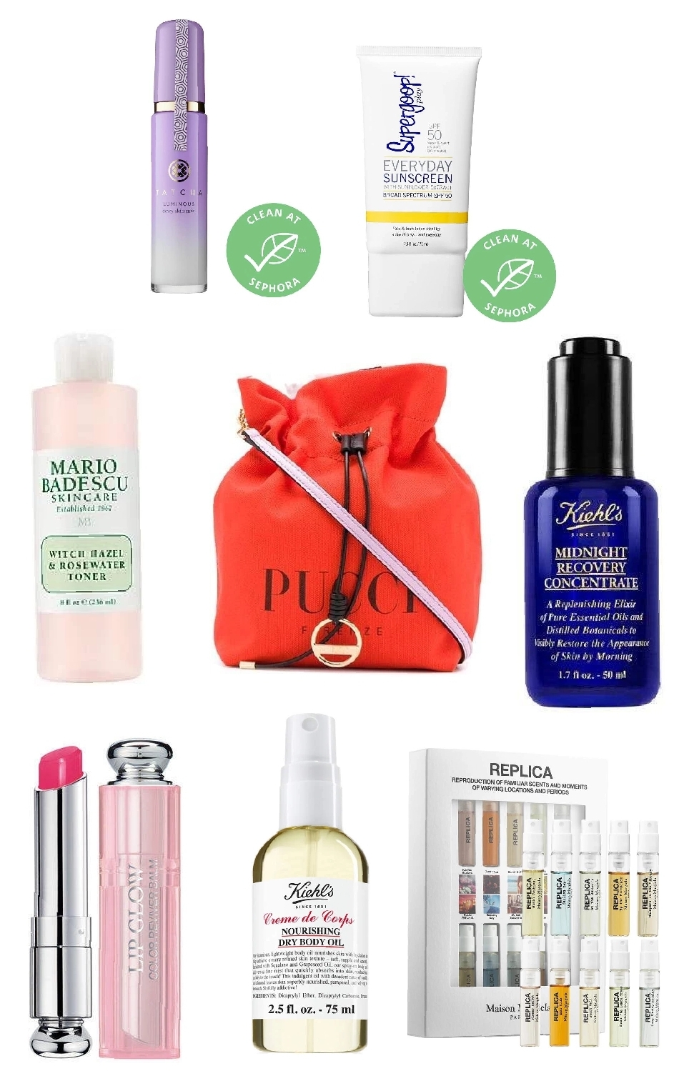 I am starting off with the sunscreen from Supergoop keeping skin protected from the start of the year. Next is the Witch Hazel Toner from Mario Badusso. According to Beauty Within “The effects from rose petals then helped to calm inflammation, reverse free radical damage, and soften skin.” In other words adding an extra boost to preserving skin. The Tatcha Luminous Dewy Mist keeps skin hydrated by using the three skin superfoods: algae, rice and green tea to give that dewy glow without interfering with the natural beauty look. Nothing is wrong with a little misty on the go, the Maison Margela perfume set which allows you to carry your favorite scent in a 0.08 oz bottle. Partnered with the Kiehls Body oil to help dryness and uneven texture. For a enhancing lip color, protecting lips with the Dior Lip Glow does the job. I felt that it was necessary to add something for the people studying or getting work done at night, I added the Kiehls Midnight Recovering. A product that erases eyebags and puffiness overtime, its qualities work overnight and leaves you feeling unrecognizable. When it comes to all of these product their needs to be a fabulous place to put them, I choose the Emilio Pucci bag. This bundle concludes the 24hr /7 pack of daily essentials to start the school year right .