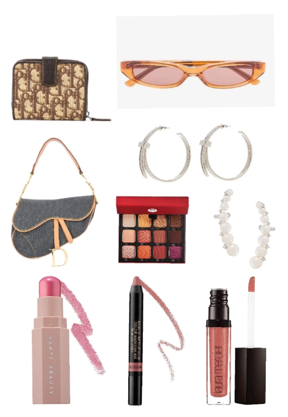 I started this look with the Visart Warm Edit Palette using shades of Saffron (pollen yellow) and Bronze Peach(gold-pink metallic) or Curcumin (bright burnt orange) and Flame(netural red-orange) to create a beautiful exciting look. The new Fenty Beauty Match Stix in Pink Lemonade, is perfect as a light pink highlighter. For the lips, I used a Nudestix lip in a dusty pink color. To gives the look some pop I added the Laura Mercier lipgloss shimmer. To give this look a vintage feel I added a Dior bag and wallet. This vintage look wouldn’t be complete without DMY BY DMY sunglasses and earrings from Ambush and Yoko London. This all came together to create a summer inspred vintage look.