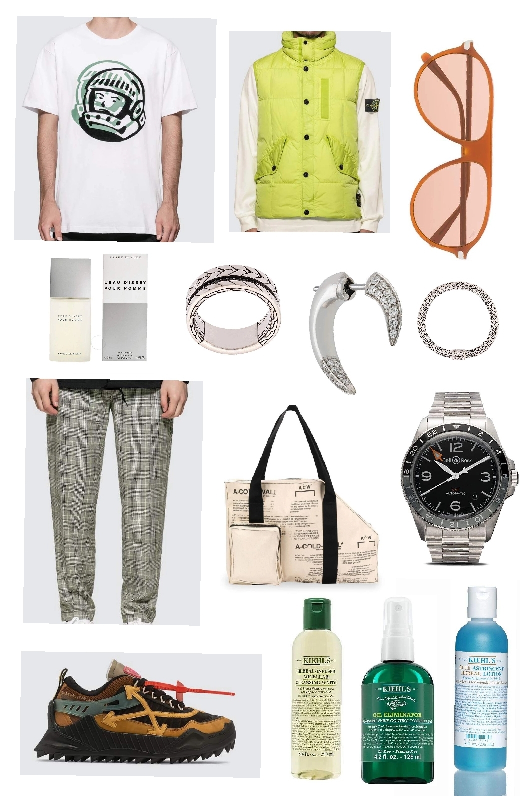 A long day of travel calls for a A COLD WALL* tote and a BRIONI aviator sunglasses. Being on schedule is important. I used the Bell & Ross BR V2-93 GMT 41mm watch. I tryed to move towards the silver tones in the John Hardy bracelet and ring along with a Shaun Leane earrings. Skincare is a must , especially when you are flying all day or on the road. These products are used on oily skin. The first item used is the Refreshing Shine Control by Kiehl’s which you use throughout the day to refresh the skin. Next is the Herbal Cleansing Oil from Kiehl’s, which gently removes makeup, dirt and oil and keeps the herbal smell. The final part of this skincare is this mysterious blue Kiehl’s lotion , which has 2 uses : 1. for oily skin that spot treatment on problem areas or 2. It can be used as an aftershave lotion. You can always add a little extra mist with the Issey Miyake Frangrance.