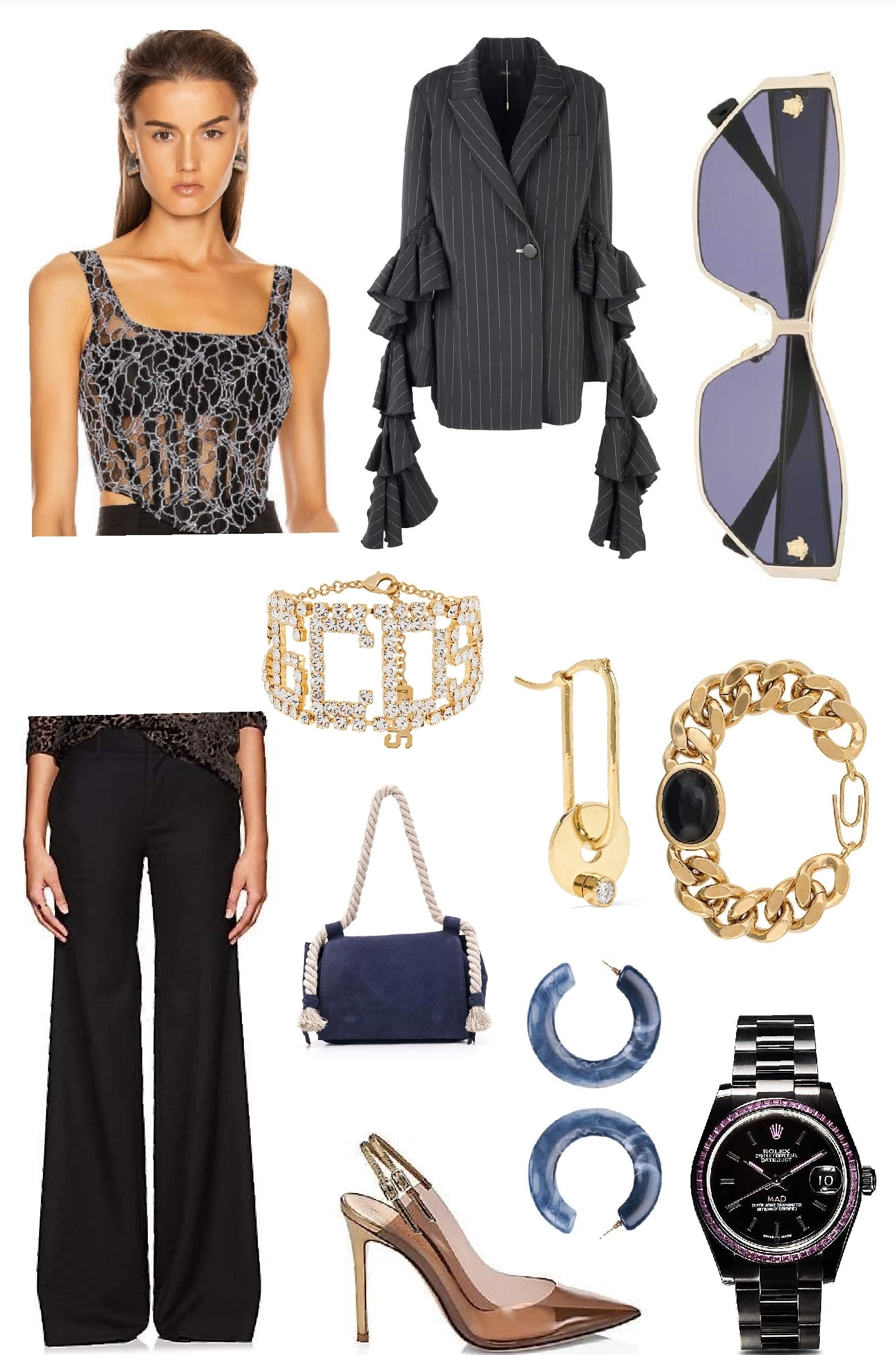 Knowing this look in corperates dark hues the jewelry I wanted to give both bold and tasteful. When thinking of my bolder piece I added GCD chocker I had been waiting to use, the thick Aurelie Biermann bracelet featuring a black Onyx stone. Onyx stone are known for according to Healing Crystal “absorb negative energy, and helps to prevent the drain of personal energy.” The meaning of this stone goes to the engry of powerful and free in fashion. The tastful pieces were the Foundrae gold earring, Cult Gaia navy blue hoops, and Rolex with the pink diamonds and cat framed Versace.