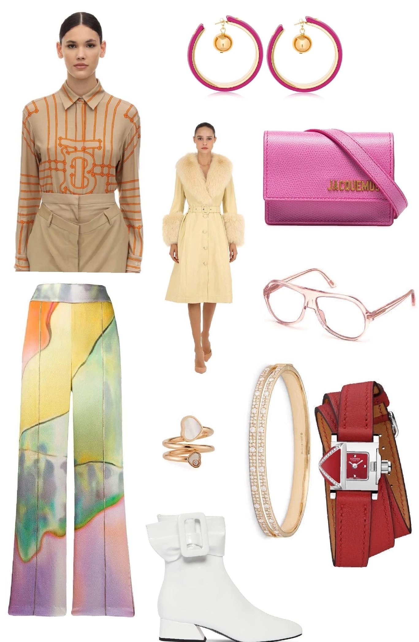 Starting with the belt fuchsia Jacquemus bag, to begin with the pink accessory picks. I added The Tom Ford glasses along with the hot pink Marni earring . A classic watch is essential, I picked the red lacquer set with 44 diamonds Hermés watch. Pairing this piece with a double bangle diamond from Lana. Top it off with the a Chopard ring from the Happy Heart collection “unites all the world’s big-hearted women”. Each piece is meaningful because it’s colors represent a part of me, with shades of pink, and my love for painting.