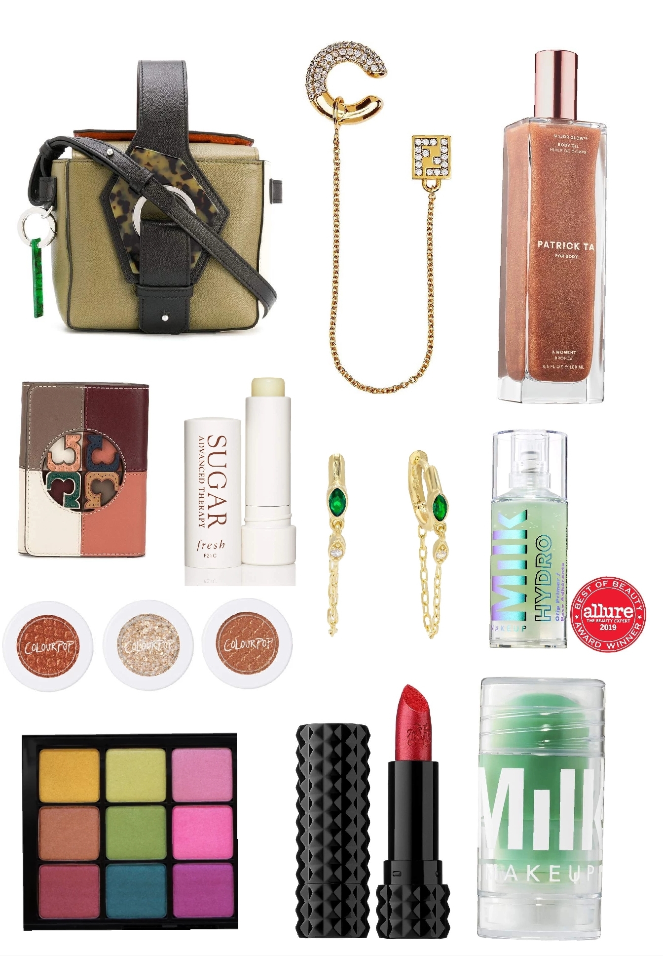 When I think of this holiday season I see a winter wonderland full of pine trees, snow and gingerbread man. Along with mints and palm trees and warm weather to represent the full tropical traveling experience. I started with the idea of skincare the Milk makeup primer to set the face along with the Milk cleanser. Next I added the Patrick Ta rose gold facial mist. Then to create this eyeshadow look I added the Viseart 02 Boheme Dream: ruby red as a base and small specs of green in the crease. For the final touch of a eyeshadow creamy Colour Pop Super Shock Trio featuring a small arrangement of rosy and pearl shimmers. Moving on to the lips I started with the Fresh beauty Sugar lip then top it off with a glimmer red Kat Von D lipstick. For jewerly and accesories I started with the mini green box Ganni bag with Tory Burch wallet. I paired it with gold Fendi cuff earring, Adina hoop earrings and a Jennifer Fisher ring. The colors of green and red come to me like the start of a new holiday season. This pulls together the first look for this collection.