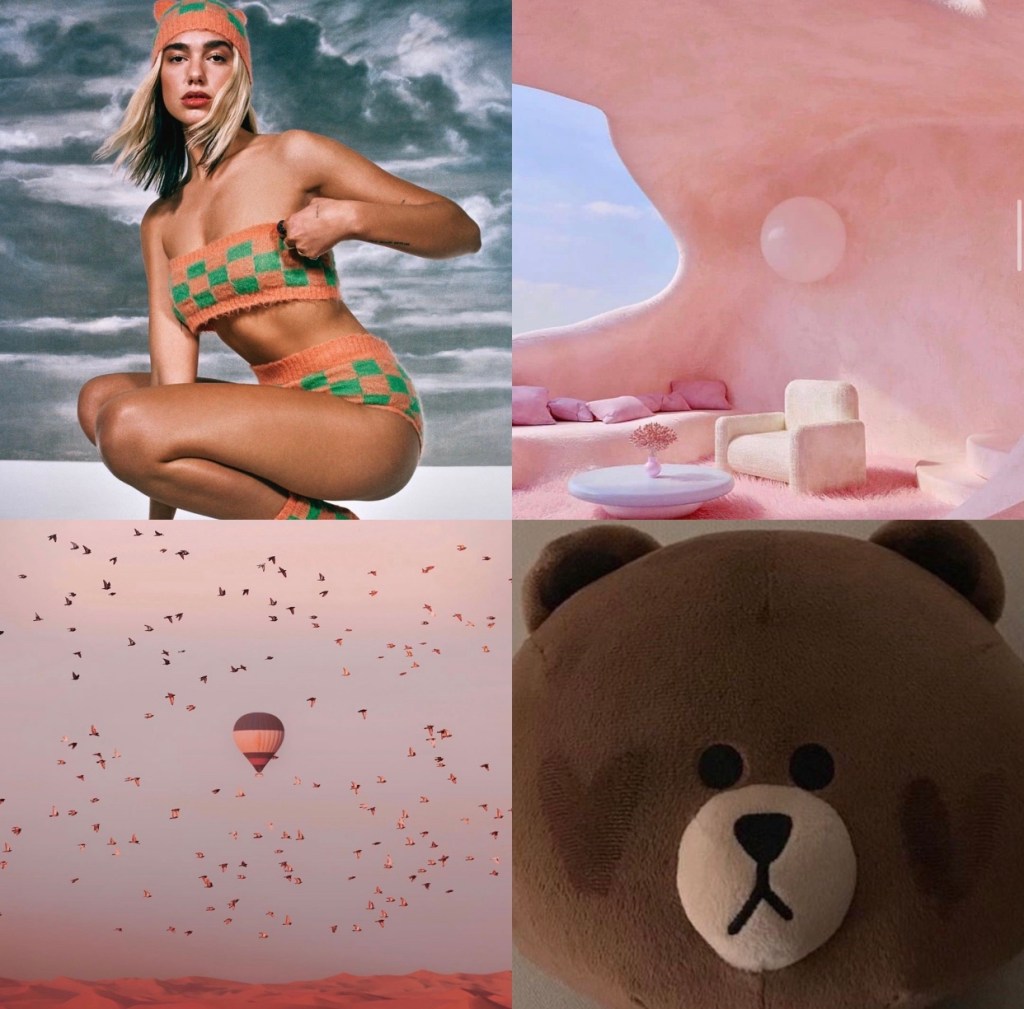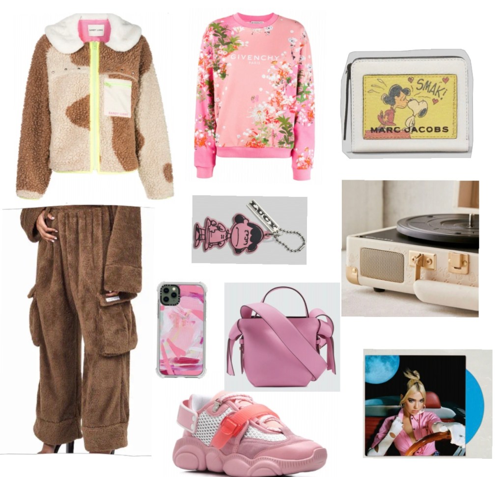 The idea of a teddy bear cozy look started with the My Mum Made It trousers described as “Double fleeced brown wide leg pants with elastic waist.” This was perfect! I paired it with equally comfortable Sandy Liang Bell fleece jacket with a pink inner lining, neon yellow zipper and white furry collar. Using a light pink painted floral print Givenchy sweater with a Dusty pink Moschino Teddy bear sneakers that has a circular shaped sole. When it comes to a dusty pink outfits it’s a necessity for the accessories to match. I started out with the round shaped Acne Studio Musubi bag with knot design and paired it with the Peanut x Marc Jacobs collaborative vintage wallet .This homage to Charlie Brown has a cartoon of Lucy kissing Snoopy. After visiting the Bookmarc store in New York which is a boutique shop in New York full of coffee table books , bags and accessories, I added the Peanuts x Marc Jacobs Lucy keychain. I completed the look with the iPhone ultra impact phone case “Pink Farm” by Caseifty. I finished this look by listening to the song Levitating by Dua Lipa on her Future Nostalgia Limited LP on the Crosley Floral Cruiser Bluetooth Record Player. New music and a outfit as cozy and warm as a teddy bear was my inspiration for creating this look.