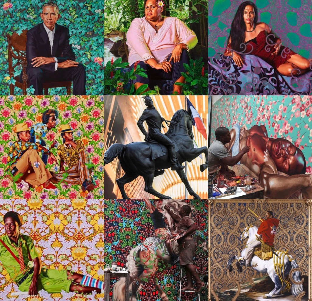 Finding Kehinde Wiley all started with a conversation after watching the Daily Show with Trever Noah. He was on the show discussing a sculpture called “Rumors of the World 2019’. “The one thing that caught my attention was the bright colorful patterns intersect within the portrait. As you can he tell he takes color patterns & meshes then into portraits and moments of history in one.