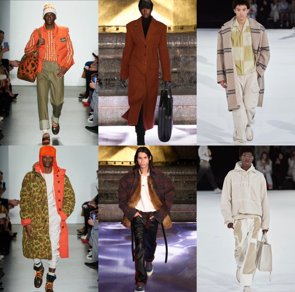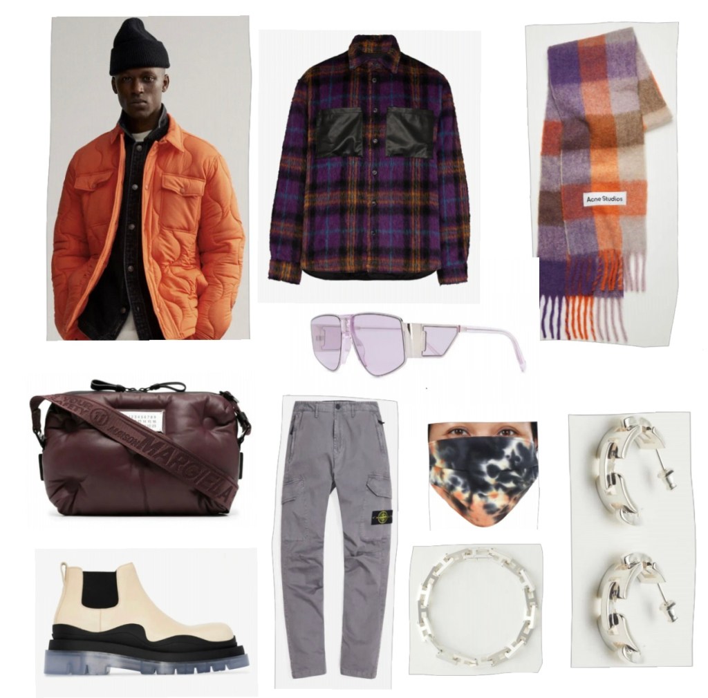 I started this look with the checkered shirt by DUOITD with its heavy wool feel perfect for breezy fall temperatures. I paired this with an Aime Leon Dore quilted water resistant puffer and Stone Island grey construction styled pants. A chunky Bottega Venta tire leather boot with a unique transparent heel. I accessorized this look with the Acne Studio scarf which coordinates with the DUOITD patterned shirt as well as the Masion Margela bag. A mask is always essential during these time of COVID-19. I found the Sixty – Nine dark Koi Mask blended well with the look with its splashes of orange, black, and white dye. I went to all silver tone jewelry with Ambush chain earring and bracelet. My final piece to complete this look the geometric Givenchy purple tinted sunglasses. All of the pieces brings the color palette I saw in the fashion show to life .