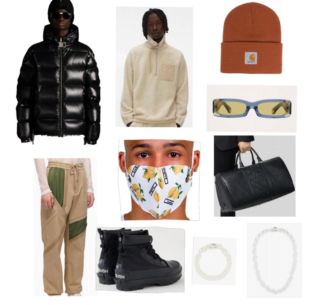trousers. I found a cool collaboration for the boots with the Ambush x Converse a chunky weather resistant boot. For a sweater I used the Helmet Lang pullover and Moncler x Alyx Studio jacket colors to pair with my accessories. The tan tones I used came from the Carhartt beanie paired with Jacquemus square shades complemented by the Versace tote perfect for a getaway. The necklace & bracelet pulled for this look was all silver designed by Le Gramme . The final and most relevant item in these times is the Lemon Logo mask by black owned brand Phlemuns. This is look is ready , set and prepared for the below freezing temperatures with a warm bundled up look.