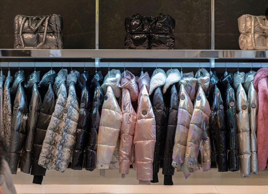 The cruelty- free brand use patterns and animal prints in jackets and metallic puffers.