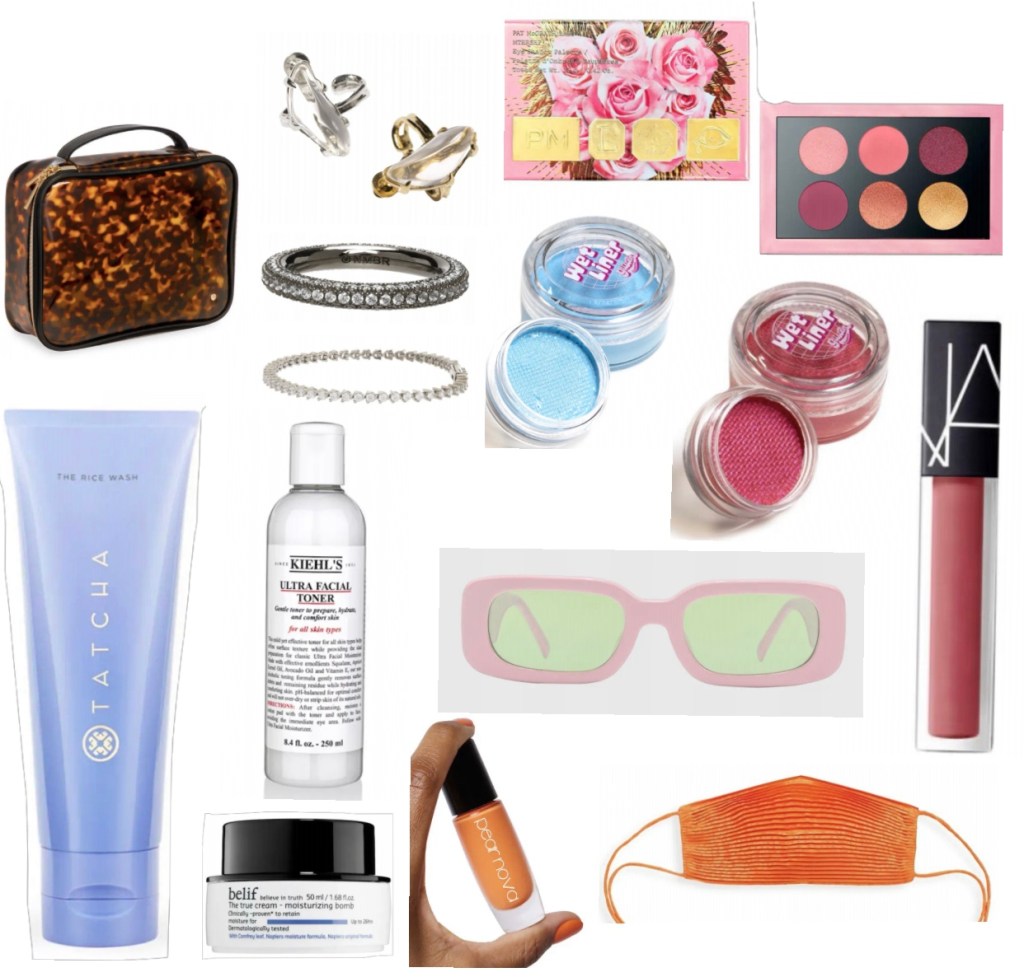 The one look that comes to mind this spring is the colorful wet liner looks I’ve showcased throughout my posts. Artists from Doja Cat to Yara Shahidi have been seen with stunning looks that have inspired me. I picked wet liner shades, Blueberry and Blushing seen on Glistening Cosmetics. For the base I used Peach Dusk from Rose Dendents , Pat McGrath palette to make the eye liner pop and the Nars lip glide. This look is paired with a strong skincare routine starting with the Rice Cleanser by Tacha. It uses ingredients like Japanese Rice Powder, a tradition used for generations that contains vitamins A, B2, B12, and E. I paired it with Kiehl toner with Apricot Oil and Avocado Oil used to balance and moisturize skin. In addition to the Belief that the True Cream Moisturizing Bomb stops dullness, uneven texture, and dryness on the face . I combine all of these essentials together in the Stephanie Johnskn cosmetic bag. The final touch is accessories starting with the Bonnie Clyde sunglasses in blush with a mint tint, and the words “ Don’t Look At Me” in small gold lettering. I compliment the accessories with a bold tarngerine orange Pearl Nova nail polish that matches the Significant Other mask. For jewelry I pick two Numbering rings and two-tone Shape of Water ear cuffs to bond the look. This beauty look is a suttle reminder that the temperatures are getting warmer and I’m starting the season with a pastel liner looks and a fresh mindset.