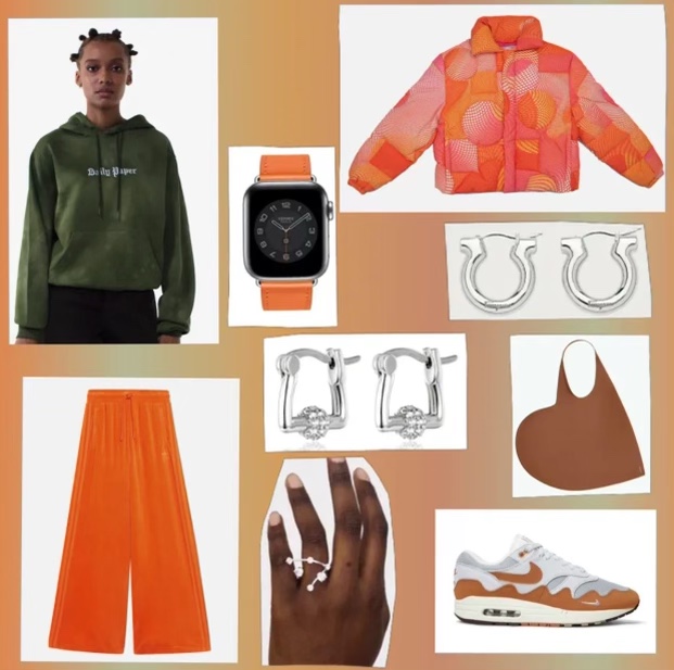 I choose the Daily Paper cozy mountain green hoodie as my starting piece because I was drawn to the washed dye that has the same colors as the bristles of a pine tree. I wanted to add the bright orange Adidas x Jeremy Scott Track suit, because of it’s velour material best for colder climates. The color of the tangerine orange track pant gave me the perfect mix of a color seen often in summer but fits well for look. The optical illusion for the ERL jacket I took the orange and pink tones from the jacket to match with the track pants and Patta x Nike air Nike 1 sneakers. For the accessories the Coperni heart tote bag caught my attention with the Apple Watch series 7 with the Hermés band. For the jewelry I kept it all in silver with the Ferragamo logo hoop, the f + h Atom Huggies Hoop earrings and Panconesi ring. The best part with this change in season is the focus of layering that connects to this look.