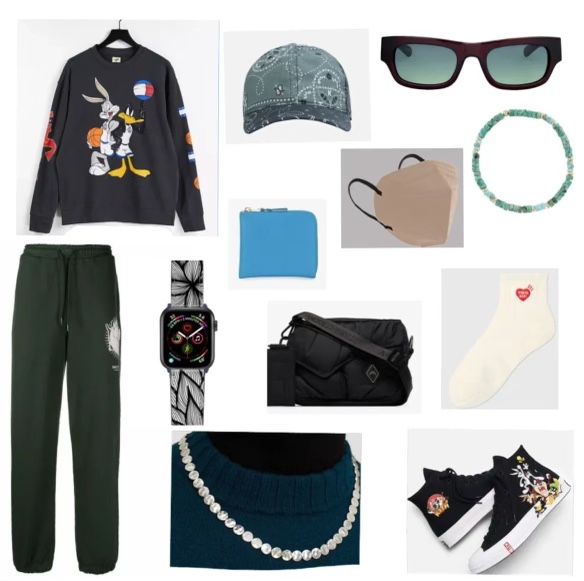 My inspiration for this look was inspired by featuring pieces from the Space Jam collection. I used this collaboration to match the color palette around the look. I started this look with the Space jam Tommy Hilifger Sweater and Emory green Daily Paper sweatpants to match this look’s color palette. For accessories, I used the Kith Bandana Cap and Frankie Flatlist sunglasses. Continuing the look with jewelry I started with silver Jill Sanders necklace and Mixed Bead Nialaya Jewelry bracelet. The Space Jam character on the graphic sweater inspired me to use this same effect with the Kith x Converse x Space Jam sneakers paired with Humanmade socks. I paired this with the lime pattern on the Casetify Apple watch band along with the crossbody handbag in a puffer material from A Cold Wall. Next is a pop of color with the light blue Bottega Venta wallet paired with the tan tone Maskc. The best way to use a collaboration such as Space Jam in a look is to find special pieces that carry a unique quality that makes the look come together as a whole.