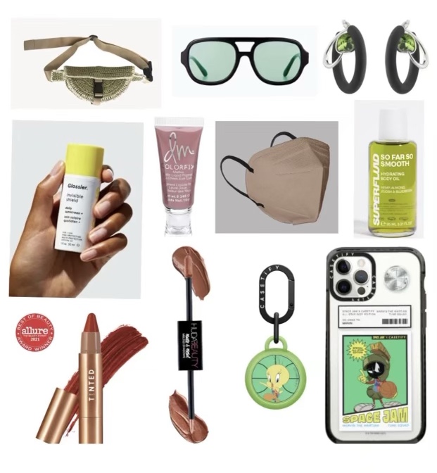 For this look my focus was using the lime green colors Space Jam campaign to guide this natural glow look. I started with the Space Jam x Casetify collaboration with the Tweety bird air tag used to protect any valuable item. I paired the air tag pair with the Caseitfy Marvin The Martan phone case. Any beauty look starts with skincare, the Glossier SPF and the hydrating body oil lets the skin be protected while still carrying a glow. In addition to improving the appearance of fine lines, blemishing, and dark stops with the Glossier Pro retinol. For the makeup I used the double sided liquid eyeshadow from Huda Beauty to give a matte and metallic touch perfect for a cat eye. For the lips I used the burnt orange Live tinted lipstick. I paired this with the light pink Danessa Myricks Beauty blush that can also be used for for the eyes and lips. The earth tone mask is from Maskc pack.