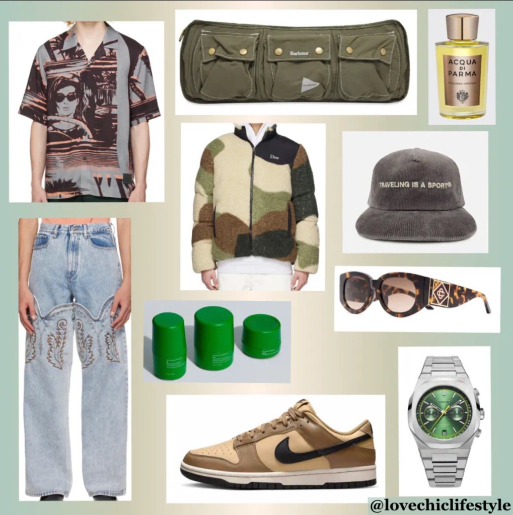 The cinema theme Paul Smith shirt features a woman in sunglasses shown driving with this perfect travel look. The Y/Project jean with the breakaway embroidery design reminds me of a vintage cowboy look. Paired with the Paul Smith shirt since temperatures can drop close to freezing the Dime puffer jacket adds a layer. The Barbour x Wander Waist Bag is functional for the weekend Joshua Tree trip featuring multiple pockets and a crossbody design. A quick skincare routine such as Humanrace Pharrell’s skincare line “three-step three-minute facial” has minimal steps and is approved by dermatologists. The cleanse, exfoliator, and moisturizer are in the Routine Pack three-minute facial and woody notes perfume from Acqua Di Parmaperfume to match the location. A classic D1 Milano watch and a few key accessories with a “Traveling Is A Sport” hat from Oyster looks great while wearing the Casablanca frame sunglasses. A view of the Mojave Desert skyline as a place to relax, hang out with friends and family while enjoying the beauty of Joshua Tree through its coldest month of December.