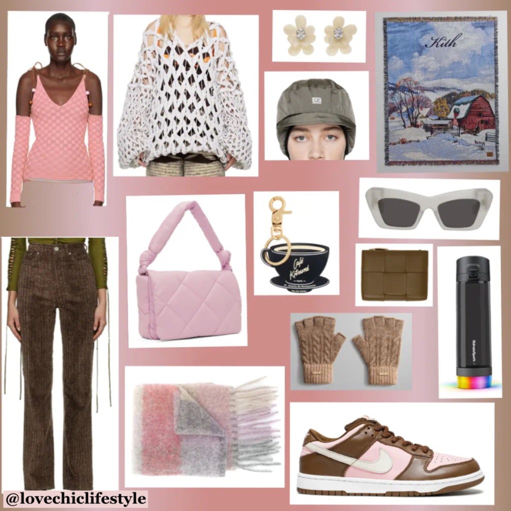I vision the transparent cable knit Isa Boulder sweater layered over top of the Andrej Gronau off-the-shoulder sweater giving both items credit. I paired it with Acne Studios brown corduroy trousers that matched the colorway of the Nike Cherry Pink and Brown Low Dunks Stussy edition. The best part of fashion other than the layering at this time of year are the limited edition Christmas collaborations. I used the Kith, Kithmas blanket and Kith fingerless gloves I pictured using while watching movies with the view of the skyline of the Niseko mountains. In cold temperatures having a thick scarf such as the Acne Studios scarf and hat like C.P Company Khanki earflap made from recycled nylon material is essential. But to add a little glitz for the holidays the Shushu / Tong white flower earrings and the Loewe Cat eye sunglasses made this look special. Thick puffer jackets and holiday drinks tie in the puffer Stand Studio bag with the Bottega Venta wallet along with the café cup Kitume keychain. Since Nieseko, Japan can reach 28 to 19 degrees , I found the Hidrate Spake Pro water bottle. It helps set hydration goals through its HidrateSpark App is set up to monitor the persons body and activity levels. The changing color of LED lights on the bottom adds a nice touch and you can carry warm drinks while staying hydrated. The holiday season is more than just aesthetic photos it is special items such as these that make the experience special.
