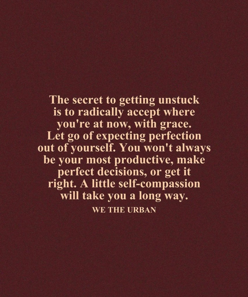 The secret to getting unstuck is to radically accept where you’re at now, with grace. Let go of expecting perfection out of yourself. You won’t always be your most productive, make perfect decisions, or get it right. A little self-compassion will take you a long way.