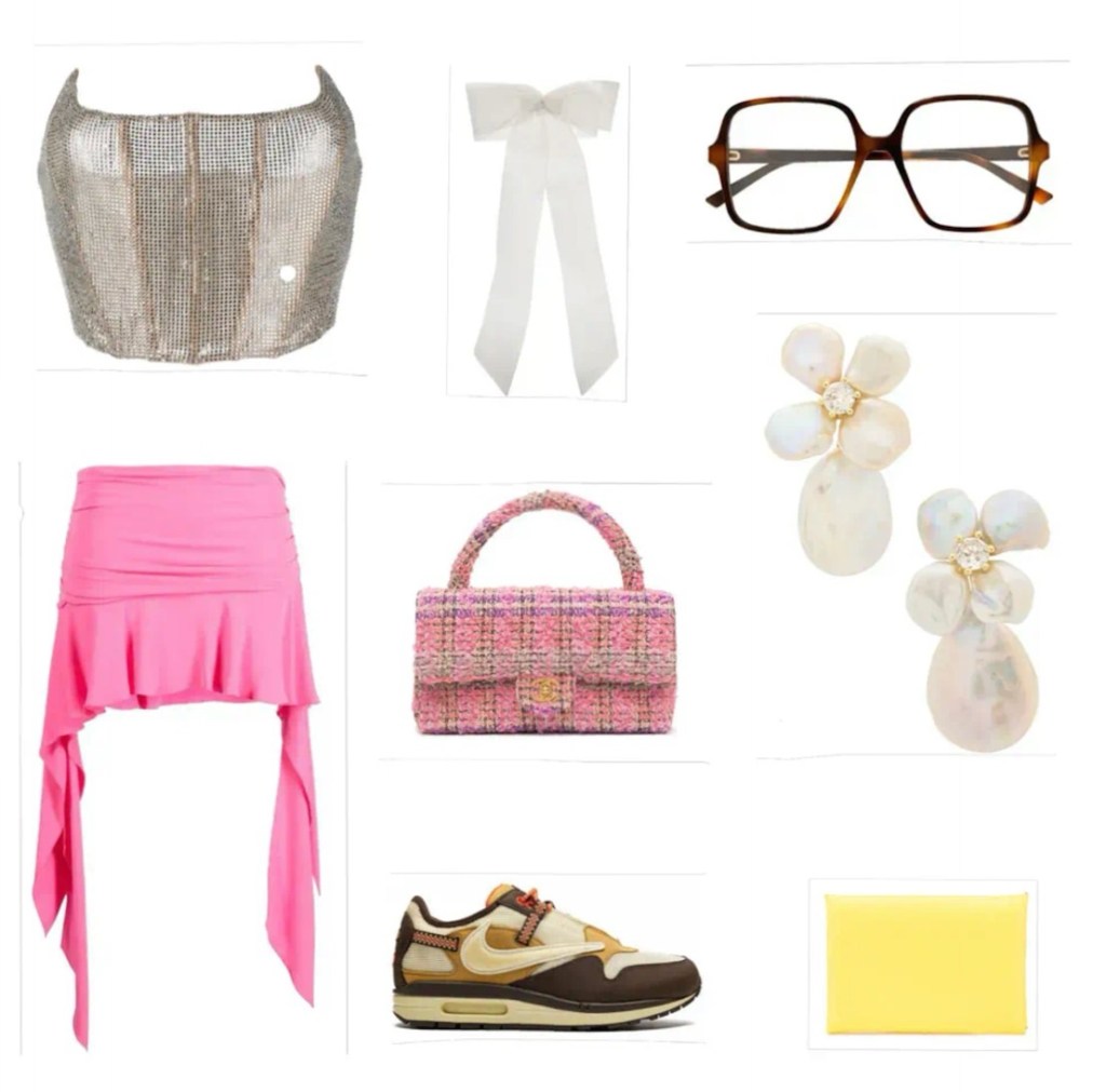 I started with the Giuseppe Di Morabito layered in gems that have reflective quality for glow like images. I kept the girly feminine look with Blumarne mini skirt. I switched the transitional heel or pump to something connects to events where someone could’ve stood for long time.I picked the Travis Scott Air Max 1 features layered colorway and waffle texture, curves shape and lace detailing. This look can be an art gallery or an open studio to packed with people connnect with an After party. After seeing the increase in eyewear I picked the Gucci wide rectangular frame eyewear.