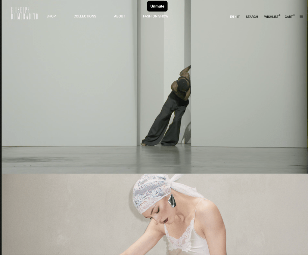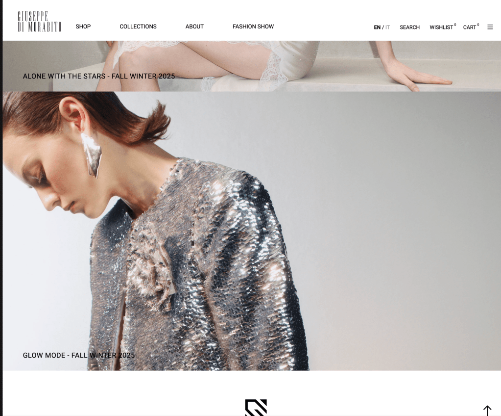 On the Giuseppe Di Morabito the website opens with Alton Mason top model with a dance background. The narration centered around of the Fall / Winter collection. The attention with harmony sounds and glimmering details. The models are smaller size but some feature tattoos which is a newer appreciative feature in the model community as prior it was not accessible. The fashion photography is the center with “Alone with the stars – Fall Winter 2025 “ campaign and the “ Glow Mode – Fall winter 2025 “. The main categories of reference shop, collections, about and fashion shows .