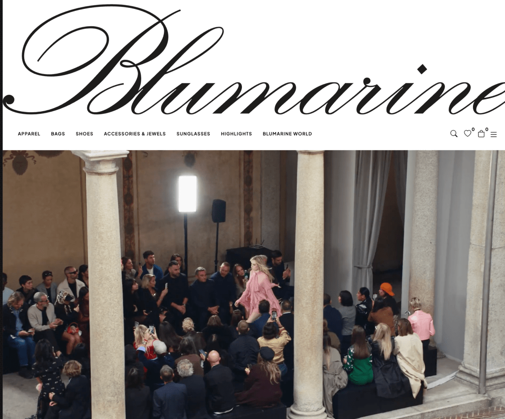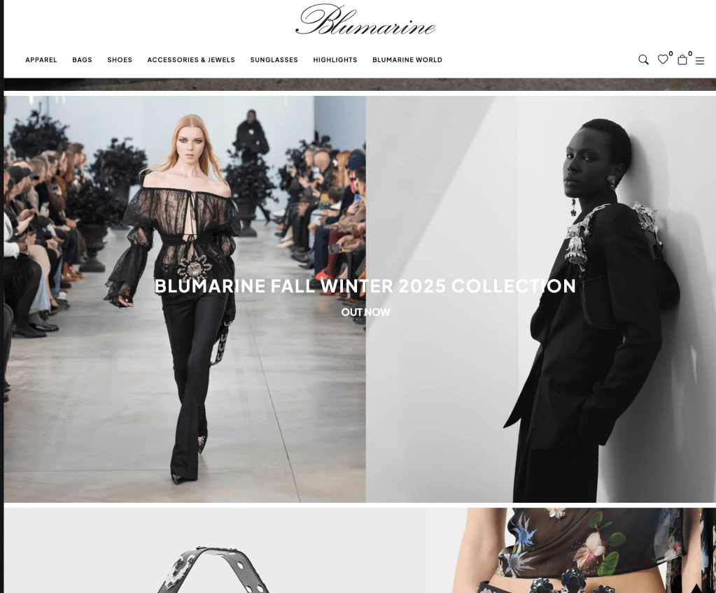 On the BLUMARINE website opens up with its most recent collection and the camera angles point from historical location as the main focus. I have seen in the collection prior were butterfly detailing was a staple to the brand. However, this is different with the tone of the models leaving somewhere that is “mysterious” but give the essence of romanic. The highlighted collections are the BLUMARINE Fall Winter 2025 collection and the bags and jewelry. The photography is mix of commercial photography with “Bag” and “Jewelry” pieces center. While the centered collection is runway shoot and the standard photography shoot. The categories that are mentioned Appeal, Bags, Shoes, Accessories and Jewels, Sunglasses, Highlights, and Bluemaine world.