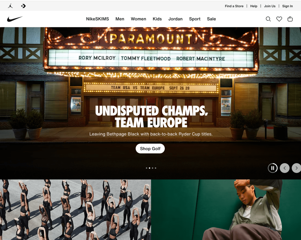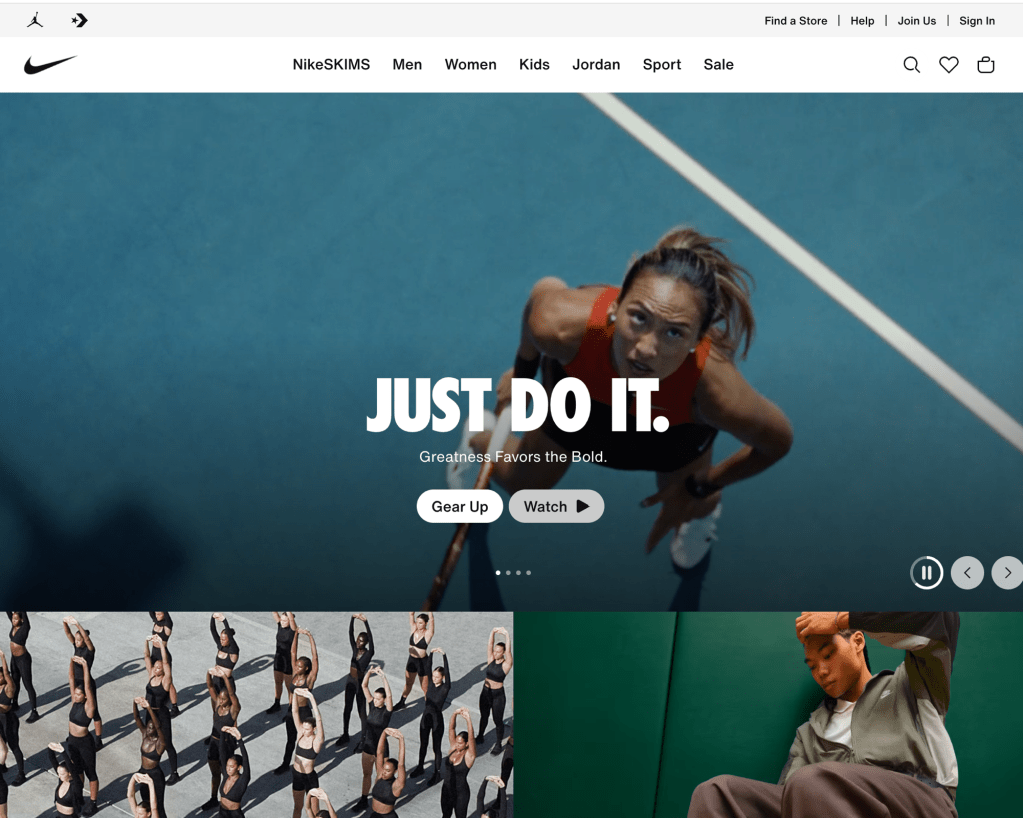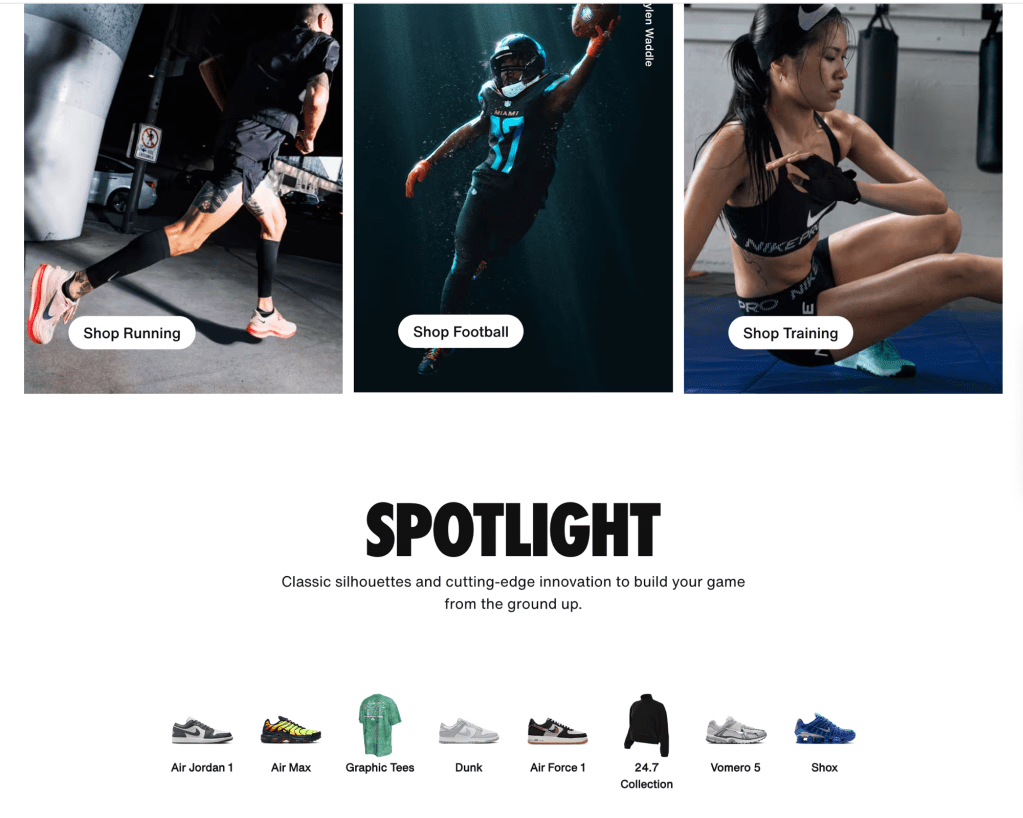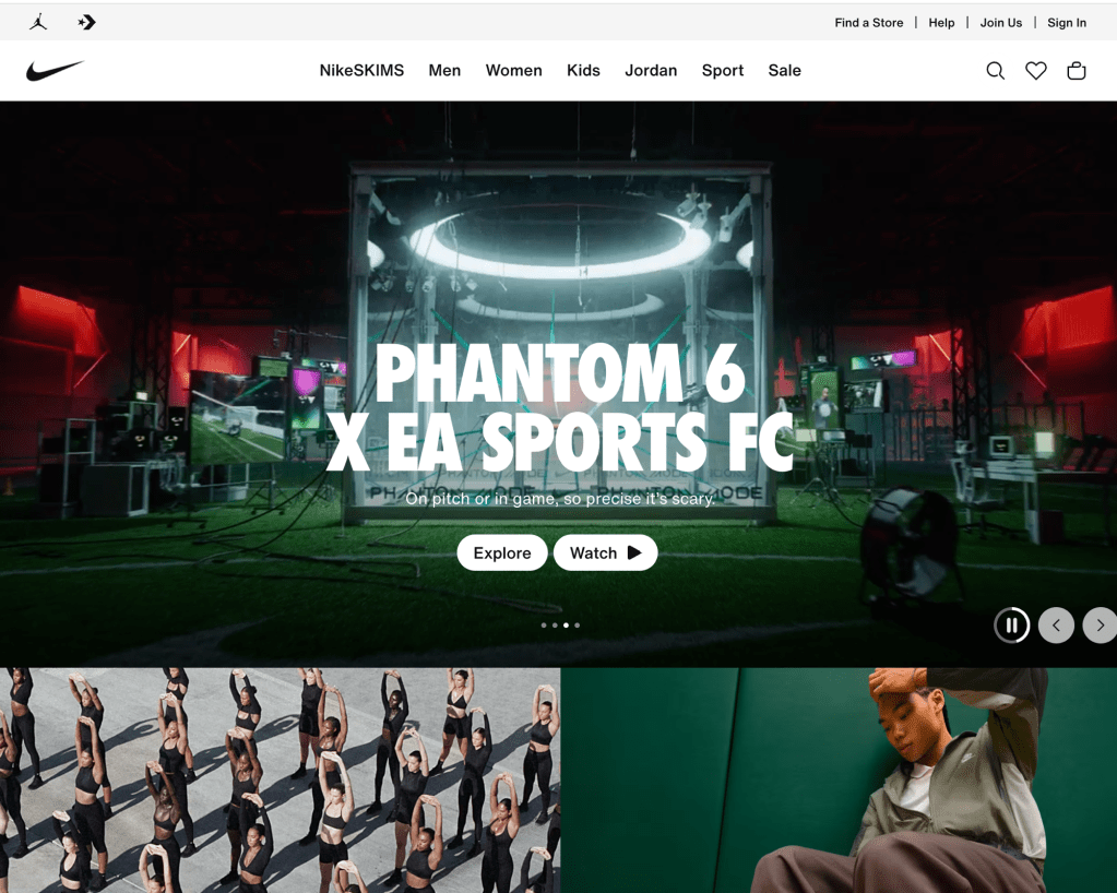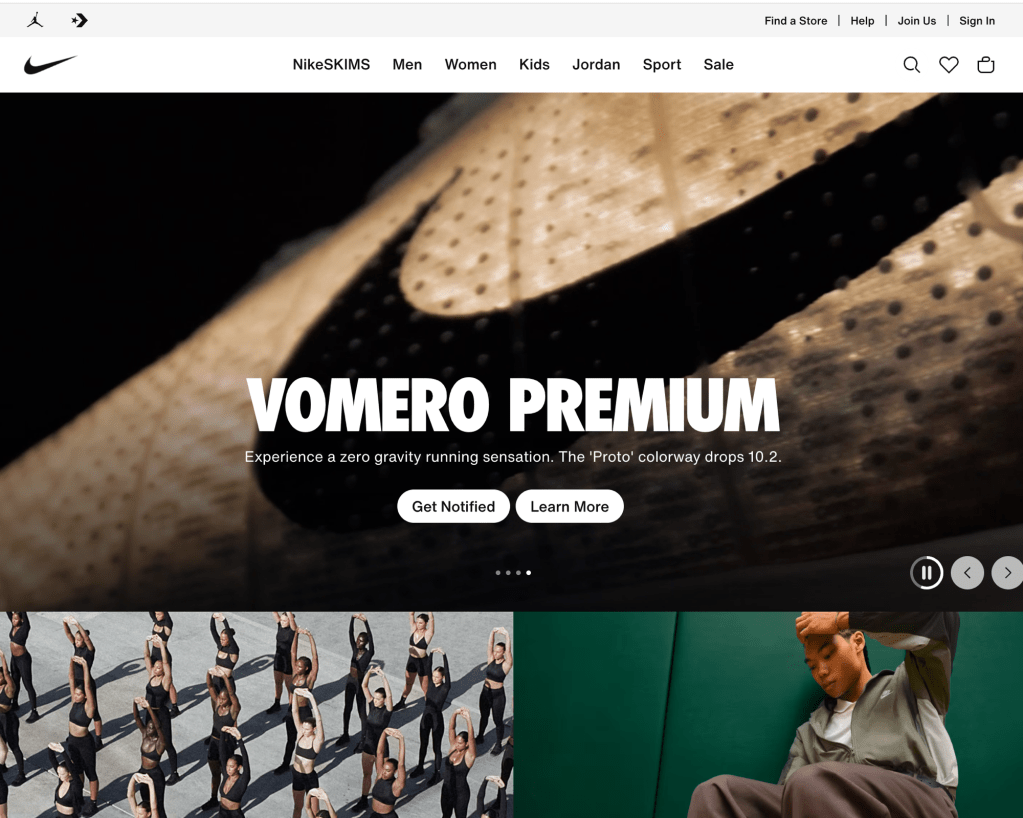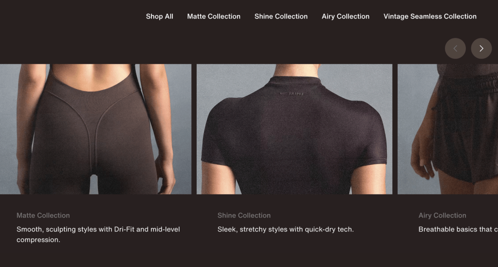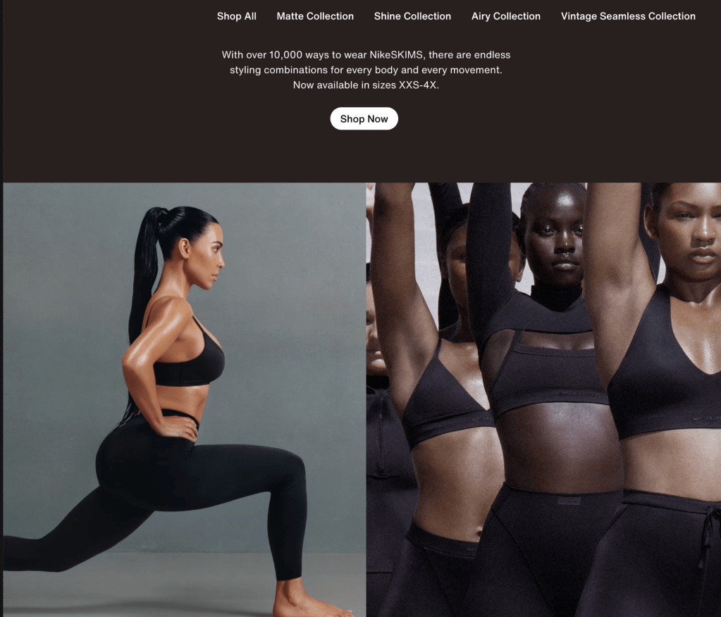 On the Nike website where it once centered around sports, they put there focus more on athleisure and newest collection Nike x Skims collection. Below features star athletes and quote that point out there how Nike x Skims connects feeling of empowerment. The lineup includes quotes from : ShaCarri Richardson, Chloe Kim, Jordan Chiles, Nelly Korda, Serena Williams, Romane Dicko, and Madison Skinner Beatriz. When you scroll it focuses on the type of fabric which refines how you look at fashion. The people that are just wanting it for the name value verses looking at it for there purpose. In the shop by collection : matte, shine, airy etc. The key categories are NikeSkims , Me , Women , Kids , Jordan , and Sports.