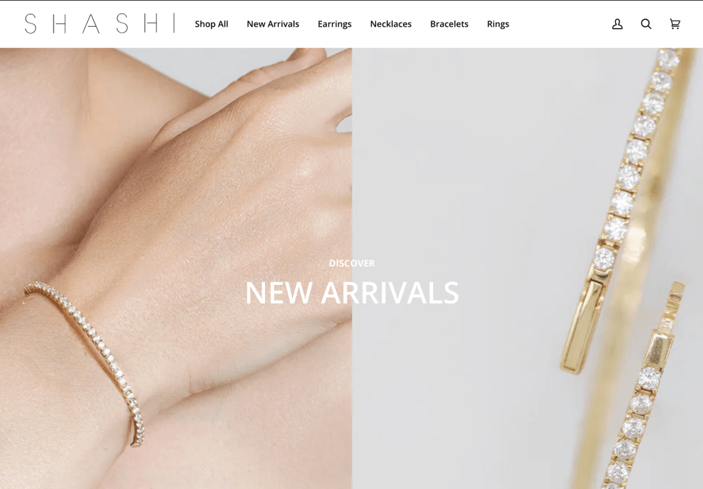 The Shashi website focus on jewelry platform where it is highlighting the details of the jewelry . The photography is done mainly through commercial photography and focus on the new arrivals and new “icons”. The models aren’t featured in every photograph with wearing jewelry. Then when you focus on the menu of the jewelry selection is Shop all , earring necklaces, earrings and bracelets.