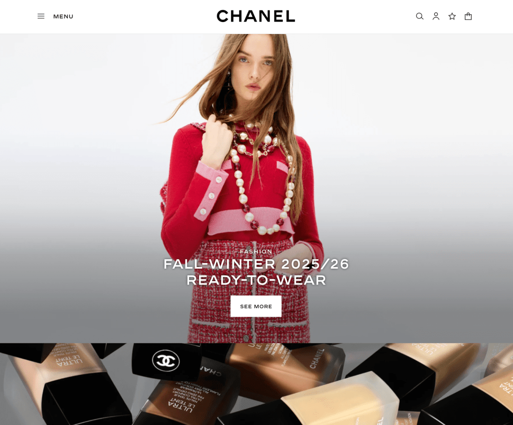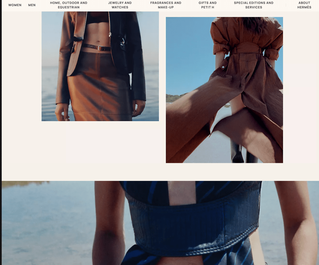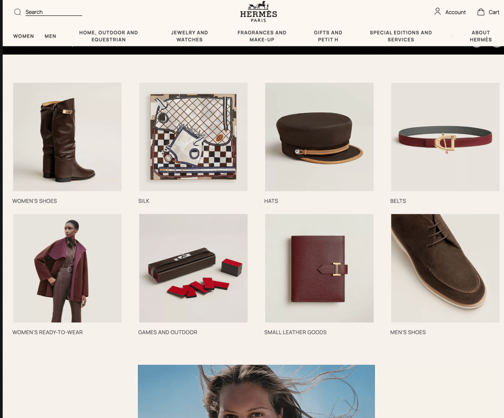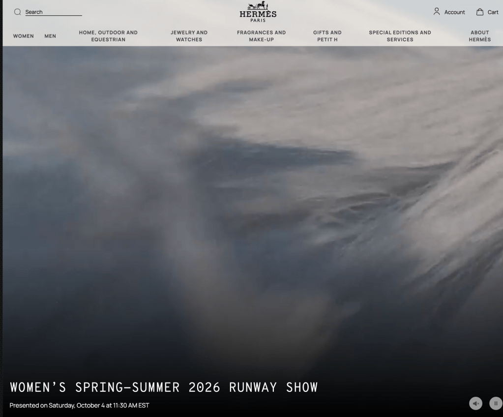 The design of Hermes shopping experience website is centered around the premiere of the Womens Spring – Summer 2026 Runway Show Oct ober 4th where it is connected to the the top lined categories. The essences of symmetry is Women’s shies, silk, hats, belts, women’s ready to wear , games and outdoor, small leather gods and men goods. Even thoough this may be seen as out of pocket by someconsumers the way the commerical photography is highlighting them on the centere page it shows a level of importance. While on the menu when you first open it has Women, Men, Home, Outdoor and Equestrian , Jewelry and Watches , Fragrances and Makeup, gifts and petit, special edition’s and services and about Hermes.
