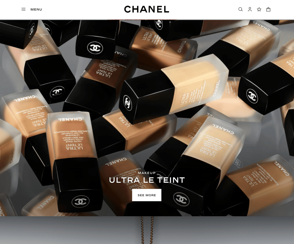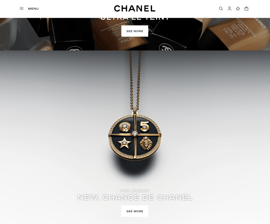The design of the Chanel shopping experience website is a patterns of the editorial fashion photography and commercial product photography. This is highlighting the main target audience known artist or celebrity campaign. Each of the links gos to the close up high quality shoot of the photography or the video.