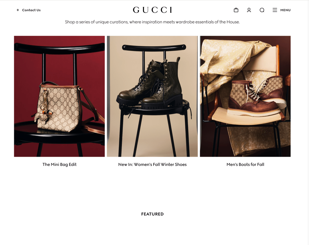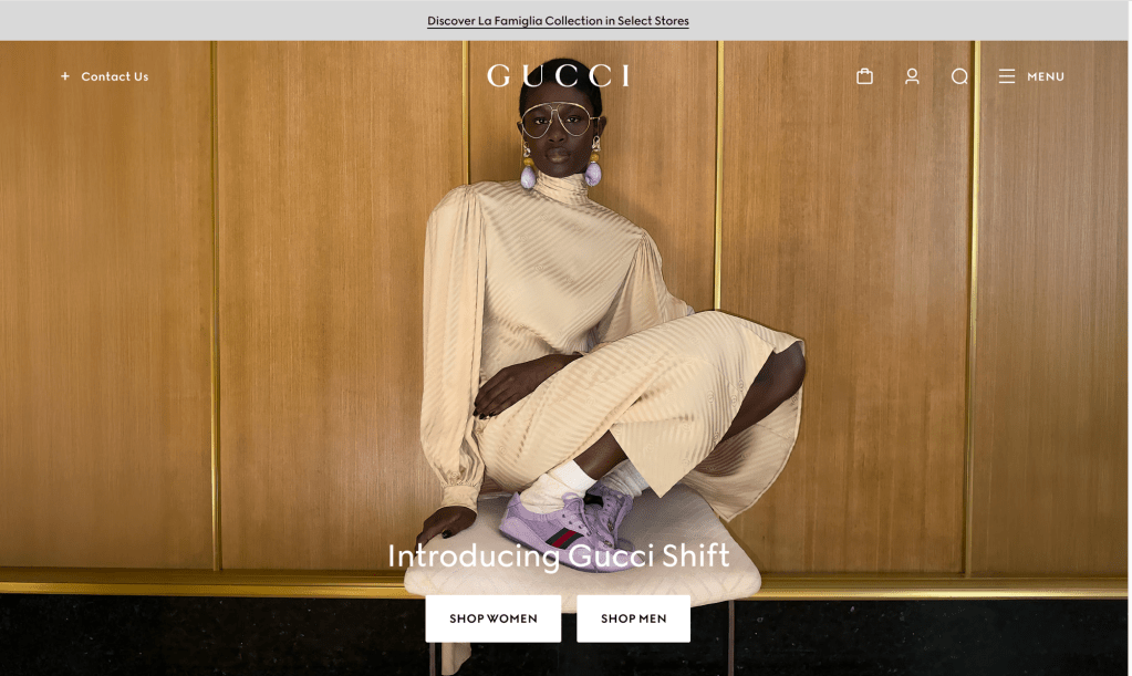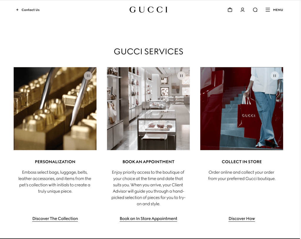 When you first opened the Gucci page it is centered around 1 black model who is center framed sitting on a chair in a silk turtleneck wrapped dress with lavender Gucci sneakers. This is centered around the “Women’s Gucci Shift Sneaker” is the color selection of 4 different colors lilac, brown, light yellow and white GG canvas. Then when you look futher in the cite focus the “narrative” or points of reference that connects to the brand itself: Seasonal Narratives, Sneakers, Gucci: La Familia, Gucci Services. But specifically the Gucci Services points out the expereiences with a gif or short video paired with the the topic iteself discussed : Personalization, Book an Appointment, and Collect In Store.