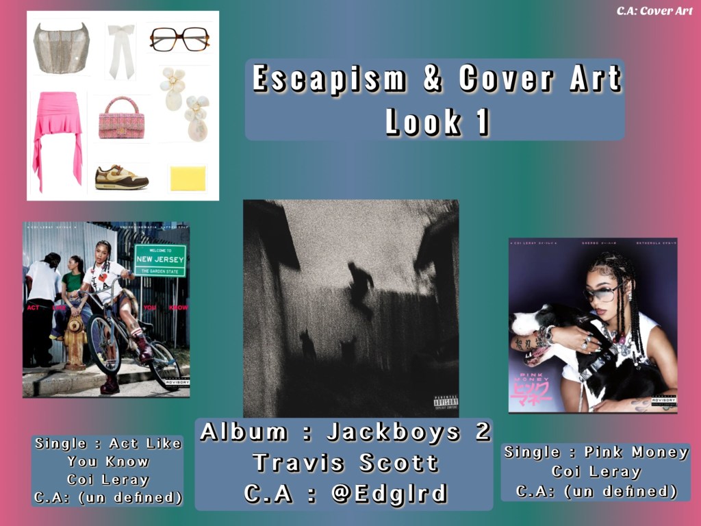 This is a collection that is taking my love for music and seeing the industry trends of looks I see at different events , festivals , parties , local function and day to day activities. But connected to the experience of the music I listen to . “Escapism” in my definition is a feeling and emotion of an experience. “Cover Art” this is in a reference of album cover art as it connects to the music. I will say several of my music piece can be “explicit” but the concept still remains the same.