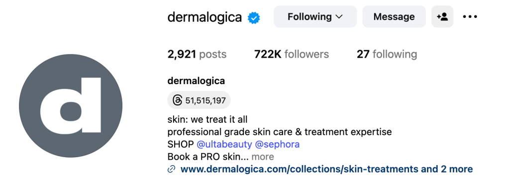 Dermalogica, with a following of 722K followers, focuses on treating all skin without limits. platform features a Linktree with the retail spaces that you can buy the product from Ulta and Sephora online shop and best sellers and skin quiz, the social impact, HSA /FSA Eligible Skin Cre, and to book an appointment at the location. The booking process of Dermalogica is connected to a spa where you can be with a professional. Below is the list of skincare treatments