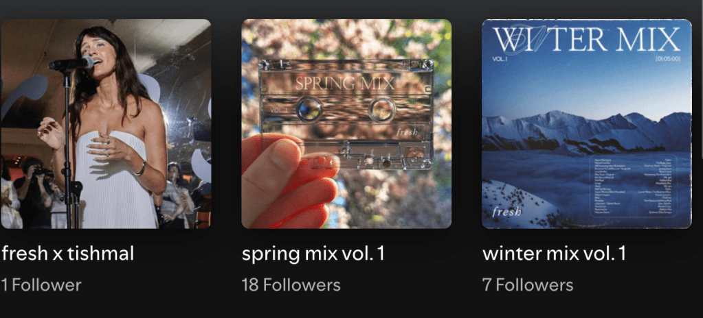 On the Fresh Beauty platform with 1M followers on the Instagram features 2 links the online account and the Spring Mix Vol 1 a speific Soptfoily playlist. This is a different type of approach conntect with audiance on a global level. I can imagine this playlist featured in the morning such as a “Get Read with Me” type of video.