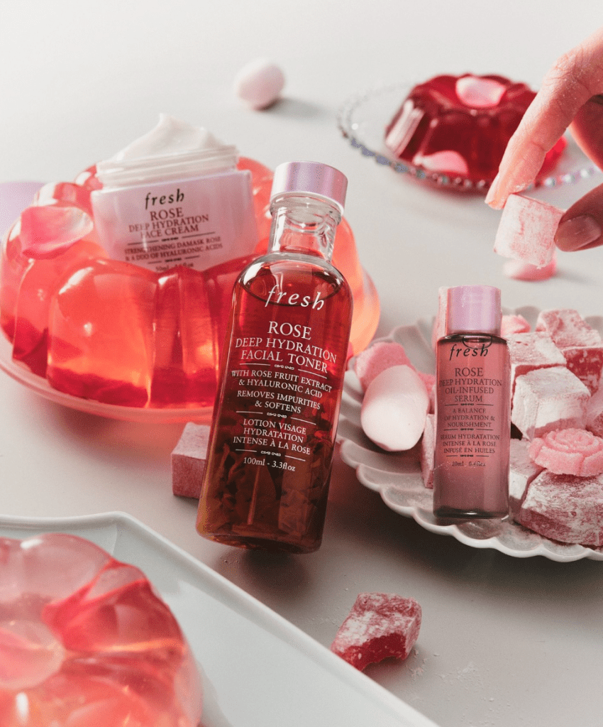 Jello and Sugar cubes are surrounded by the Rose Deep Hydration Facial Toner, with studio lighting that creates a feminine and sweet character around the product.