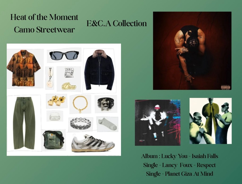 The use of patterns and graphic design prints that match the warm and earthtone colorpaletter of fall The detials of the blank adadis sneaker wit the separation of the white waffle print layered in the spotted grey overally. The detials matached the the misbv burn tone graphic shrit.