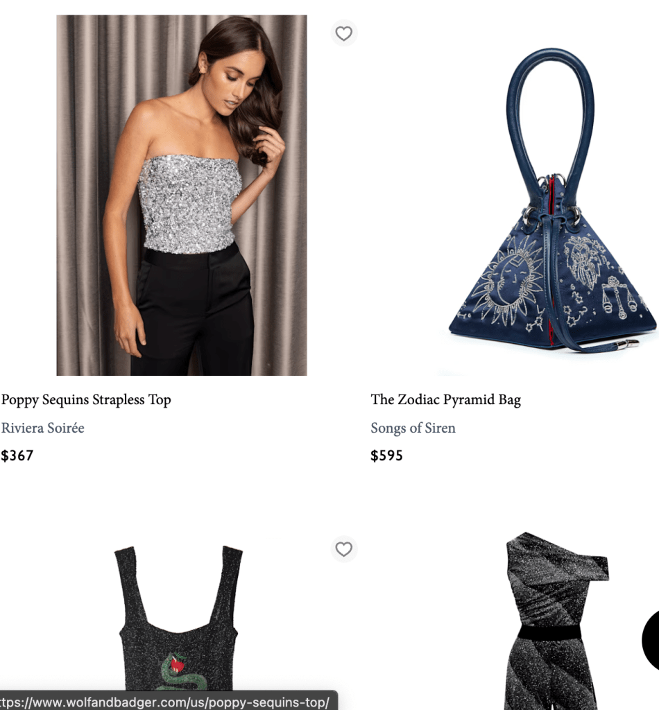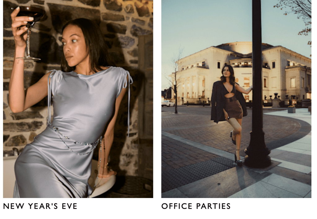 For the feminine millennials buyer I can see this brand most for. The designs carry longevity not mainly trend heavy. Of course this like all the brands is for everyone. Their page is centered around different styles for holiday season of party. Events include: New Years, Office Parites , Winter Ball and Christmas Dresses. The office parties and the New Year categories both different occasions I was most drawn to.