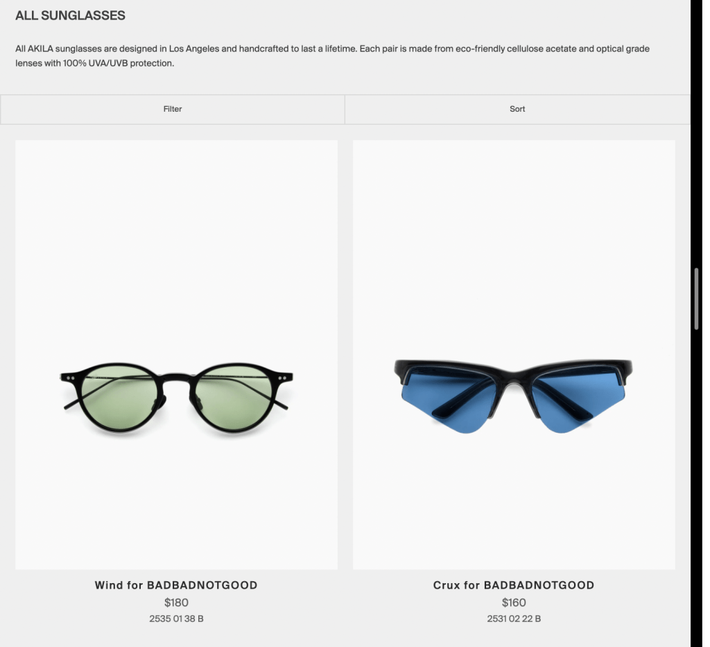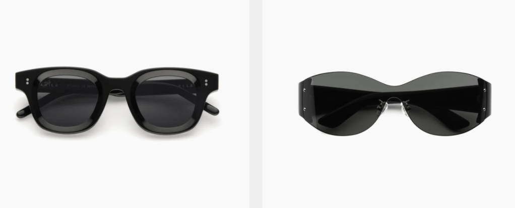 Akila focus on the shape and variety is not categories to any speific type that gives a social media effect of scolling for days. The shapes include: aviator , cat eye , geometirc, round, oversized, square and wrap. The majority of the glasses come in a mid to dark tint for the celebriety effect.