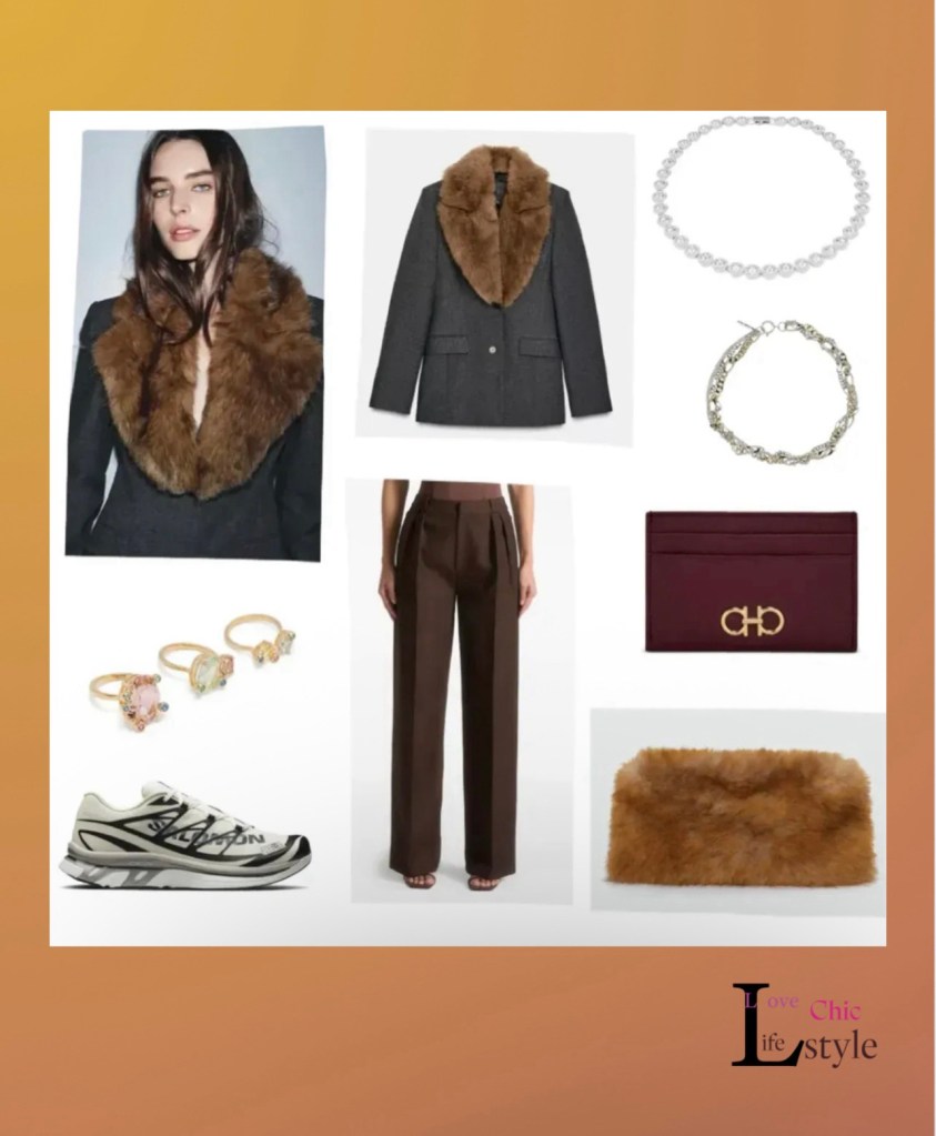 A mix of luxury fashion and street fashion. The women in the center is the outerwear dark mocha trench coat with fur collar represent women wear. Then the men a minimal matching sweatsuit from the men’s wear.