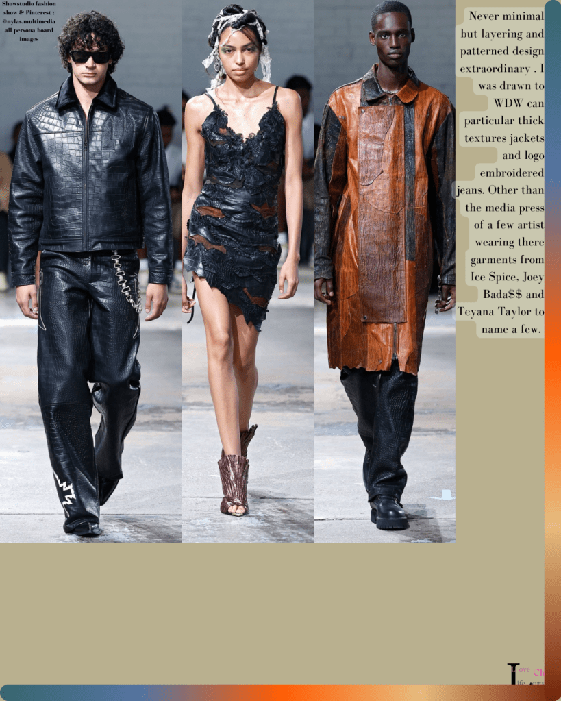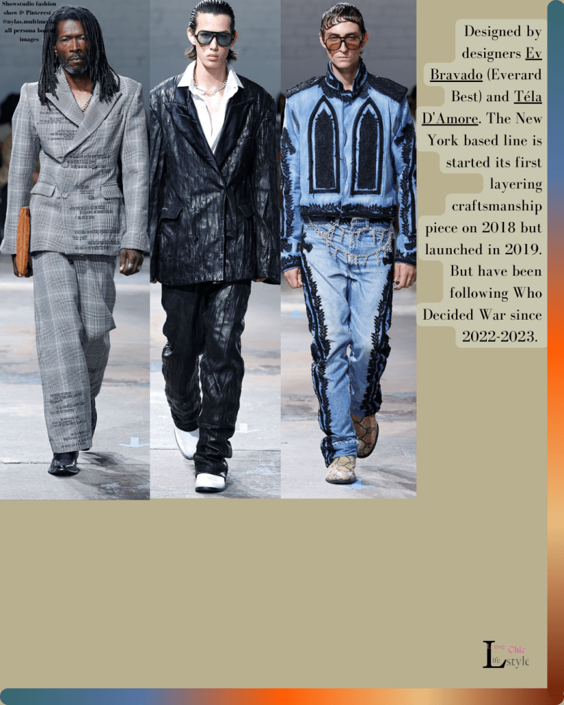 Designed by designers Ev Bravado (Everard Best) and Téla D’Amore. The New York based line is started its first layering craftsmanship piece on 2018 but launched in 2019. But have been following Who Decided War since 2022-2023. Never minimal but layering and patterned design extraordinary . I was drawn to WDW can particular thick textures jackets and logo embroidered jeans. Other than the media press of a few artist wearing there garments from Ice Spice, Joey Bada$$ and Teyana Taylor to name a few.