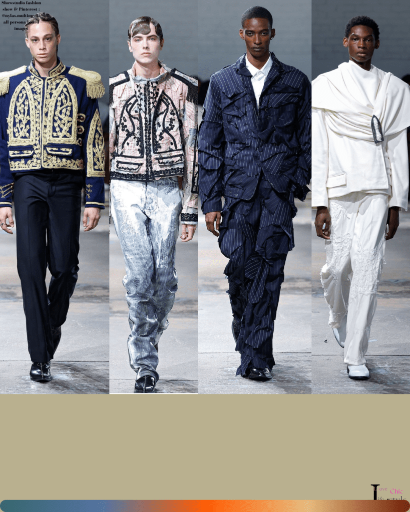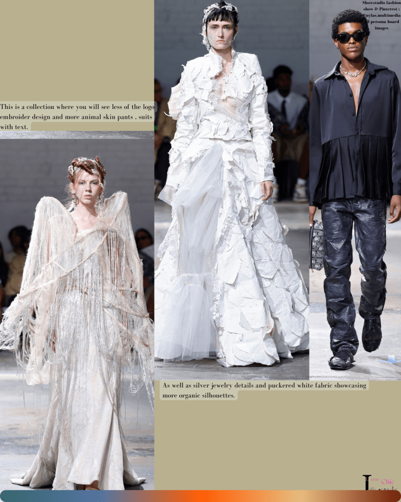 This is a collection where you will see less of the logo embroider design and more animal skin pants , suits with text. As well as silver jewelry details and puckered white fabric showcasing more organic silhouettes.