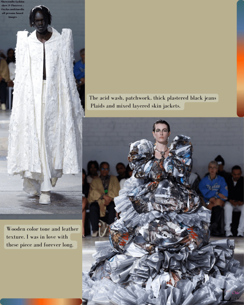Plaids and mixed layered skin jackets. Wooden color tone and leather texture. I was in love with these piece and forever long.