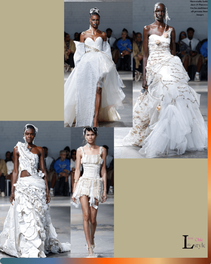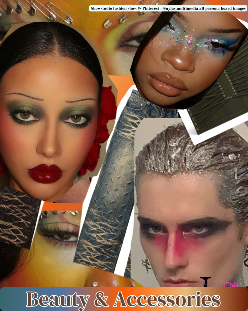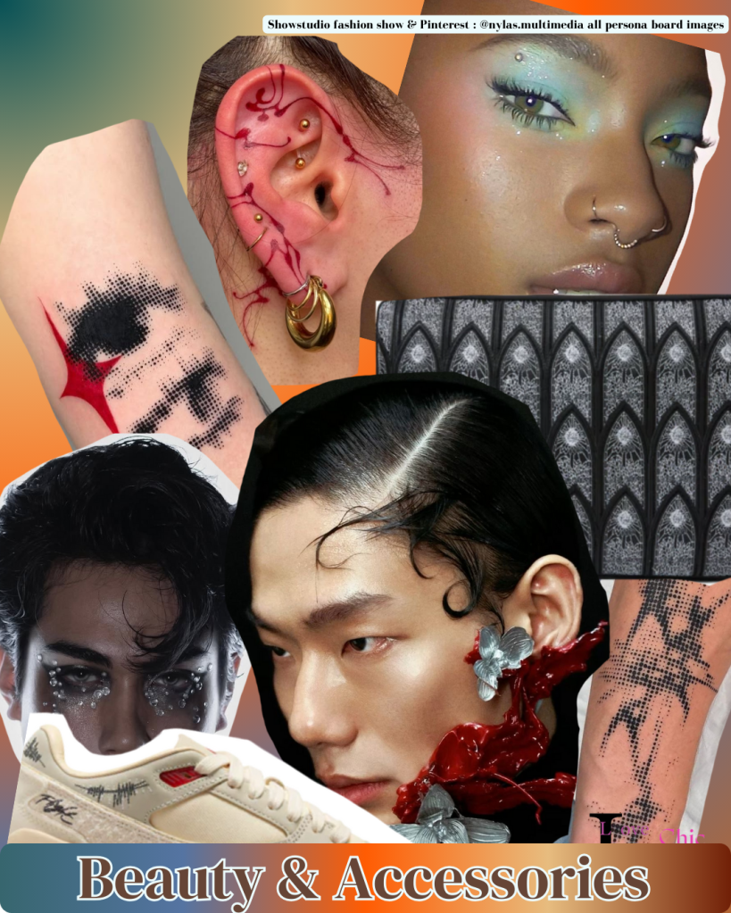 For the Runway Persona when it came to accessories and beauty. The look was Avant garden tattoo art ( think surrealist) , the beauty glow in green to red and brown color palette to pearls. The hair similar to the collection is perfectly curly and looped in position. The statement pieces that connect with the collect were the D’AMORE XL TOTE , Tela D’ amore x Jordan flight court sneakers , Kennedy sleeve and thread plate denim.