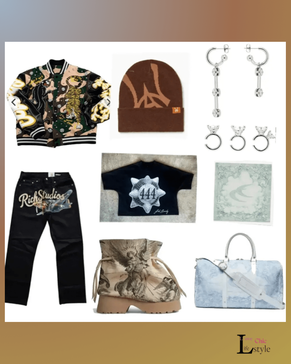What started as a look where I wanted to use the saved pieces that haven’t been turned into a lookended with a representative print and graphic design design fit. I started the fit embroidery with the blank bomber. I love the tiger mixed with cameo with the OM X H.A.W. VARSITY JACKET with motivational message , “ Himan at war with peace.’ . I paired with the denim from blank. When it came across several of these brands on INstagram. I sugggest you all reading to keep up with the brands that I listed and going to the suggestion to other brands. I am excited to see what is to come. For the other detials of this look were the artifacts print on the Angel boots from Jenue Couture using the loose structured boot as a canvas for angels grabs your attention. I followed this by the fine paint like detials on sky blue Scuffer duffle bag with the similar detials to the mint bandada. When it comes to people face accessoies earrings and hat and headwear are a must . i started with Wisdom of Age hat followed by long time favorite Justine Clenquet.