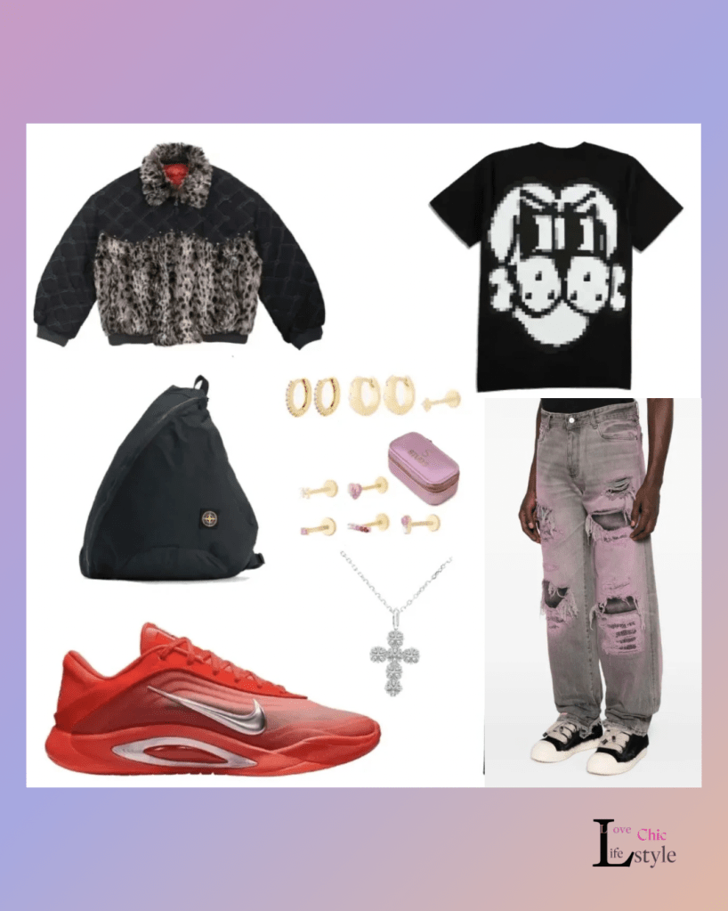 I started with the Lepardo Quited jacket is a warm statement for the cold season. I paired with the Pixeles FinesesPup Tee switching to graphic design and graffiti style. The PDF ripped denim jeans are apart of the grungy look that connects with the pixelated Tee. For the sneakers I used from the prior post 15 Valentine Color way & walk through roses piece featuring the Nike A’One ‘ Royal Flame’. For the bag I took to one of the top both utility and statement Stone Island Tela Sling triangular shaped bag. For the jewelry I continue with the Studs & Midnight Factory, All coined to a Tee as a mixed media fit.