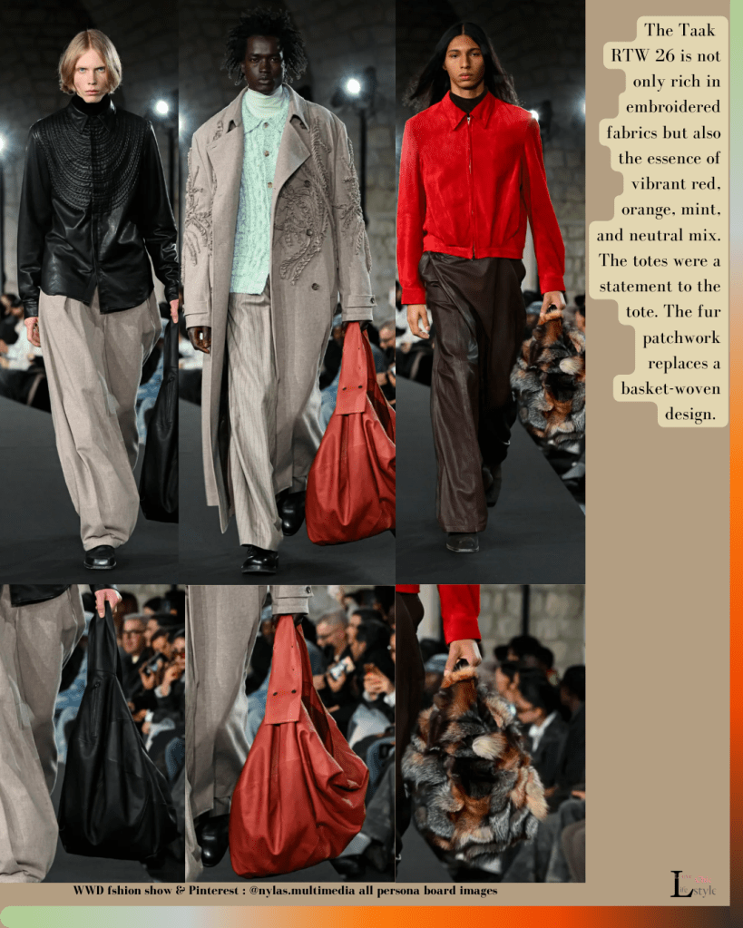 RTW 26 is not only rich in embroidered fabrics but also the essence of vibrant red, orange, mint, and neutral mix. The totes were a statement to the tote. The fur patchwork replaces a basket-woven design.
