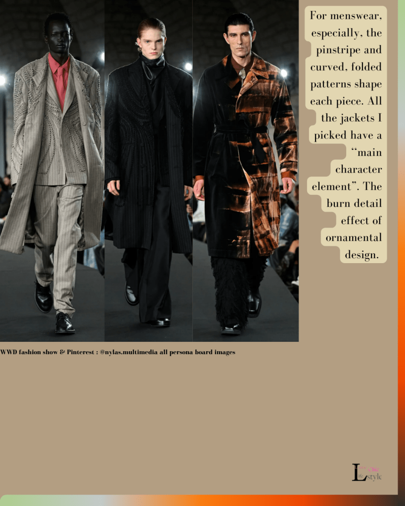 For menswear, especially, the pinstripe and curved, folded patterns shape each piece. All the jackets I picked have a ‘‘main character element”. The burn detail effect of ornamental design.
