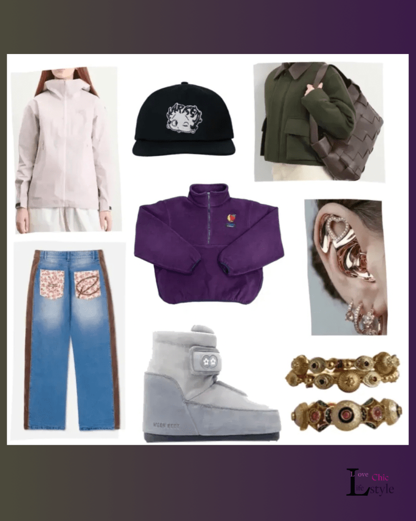 Ryoko Rain was the first piece in my concept of reworking the same piece. The leather-sided fridge is what inspired me to continue with the details on the tote bag. The mention of the Vandy the Pink’s newest collaboration with MoonBoots was the center. The puffer style boot only style piece is the logo flower on the strap. The use of iconography travels to the Sky Farm Goods Jacket and woven details of the “Market” Market Studio Betty Boop Hat.