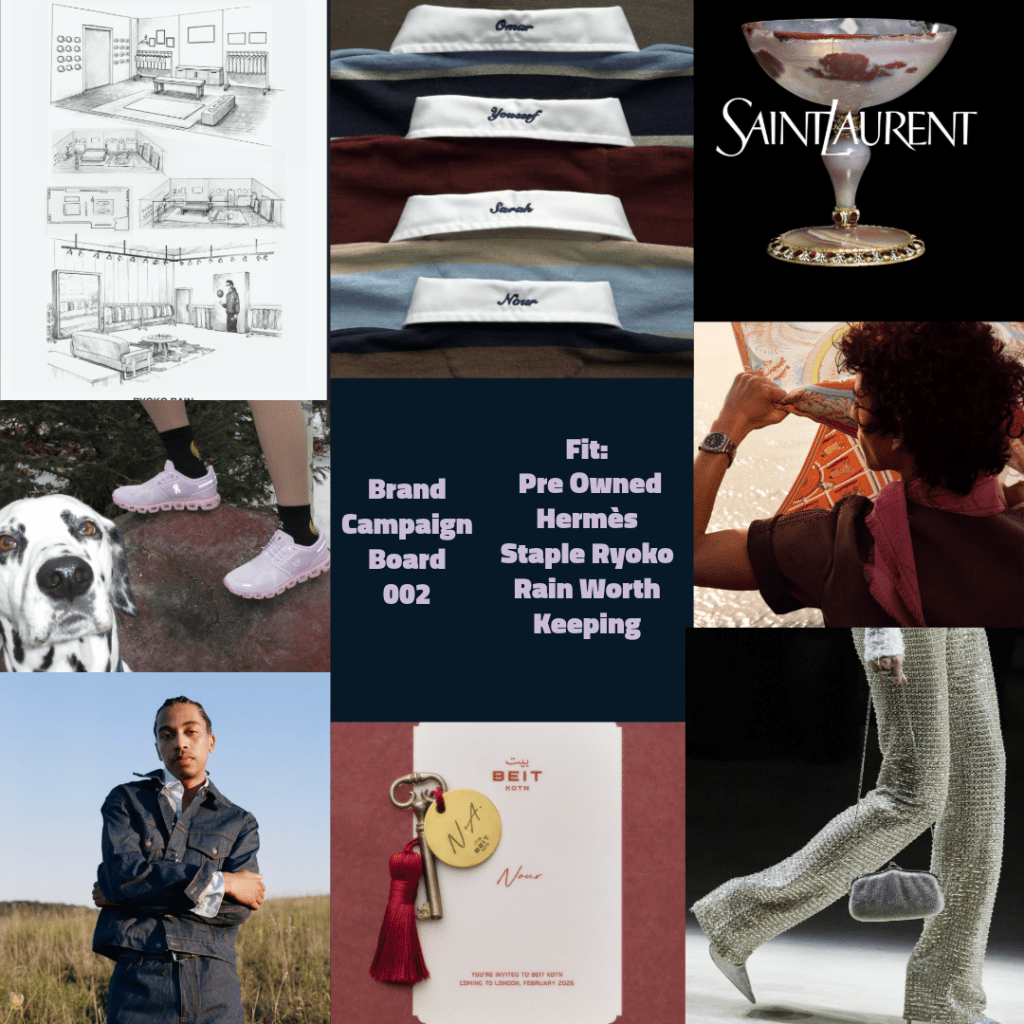 This is the 2nd Brabd Campaign Board of my fits. This is a series of campaign that connect with the brands used for the latest fit. Hermes takes the sea with arrangement of scarfs, while powerhouse and mature Saint Laurant and Gucci. The transition of the woods and outdoor living with the Kotn needed addition to hotel to the On x Sky Farms sneaker and appeal collaboration. The experience of evolution of taking the the ig carousel comes to life with the latest Ryoko Rain sketches of store designs.