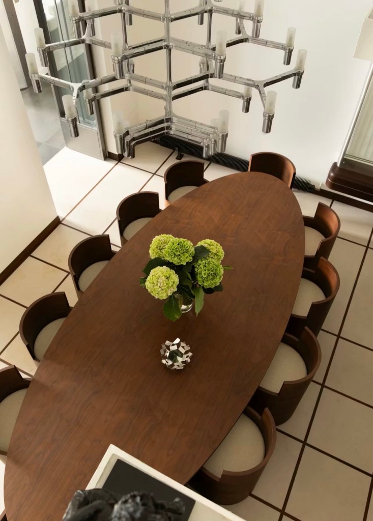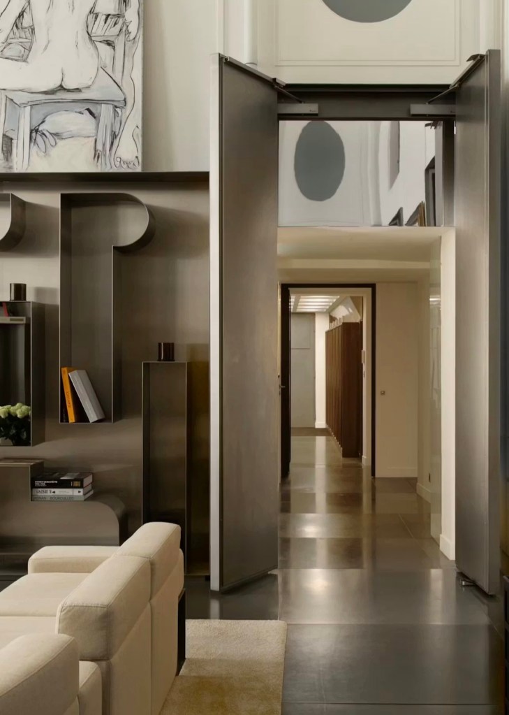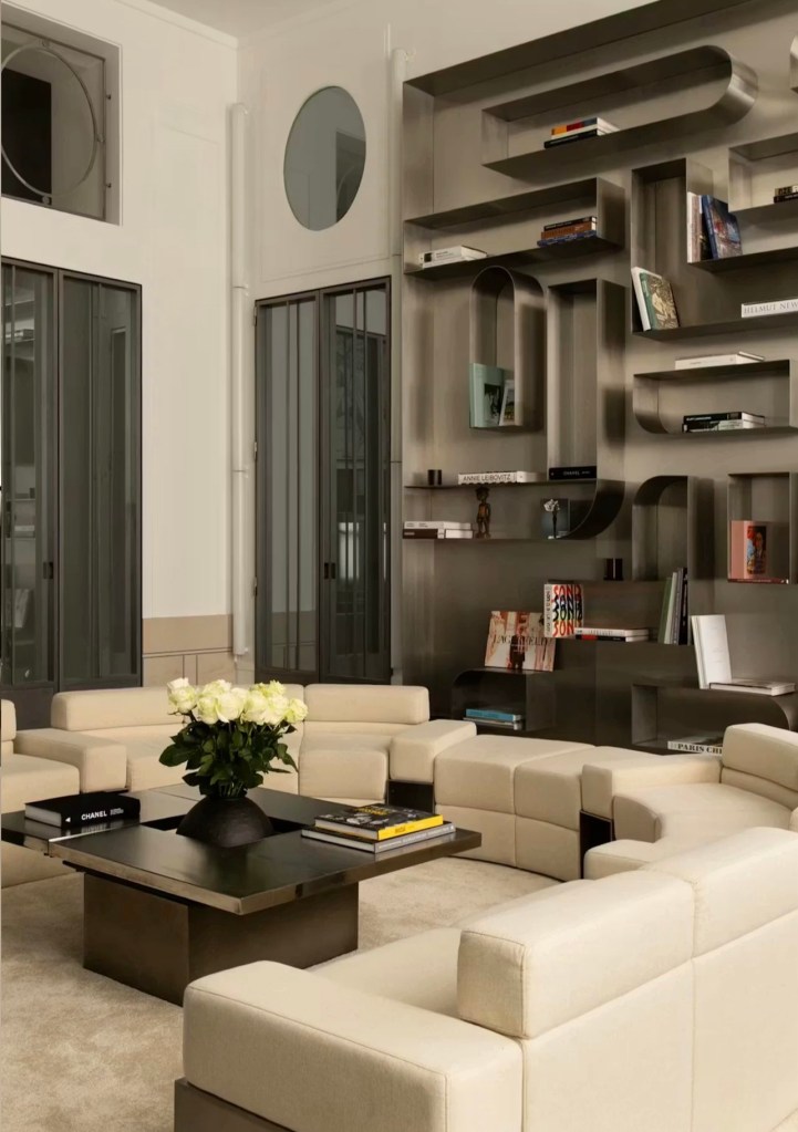 Lagerfeld designed the curved staircase with geometric steel banister that remains at the center of the apartment.