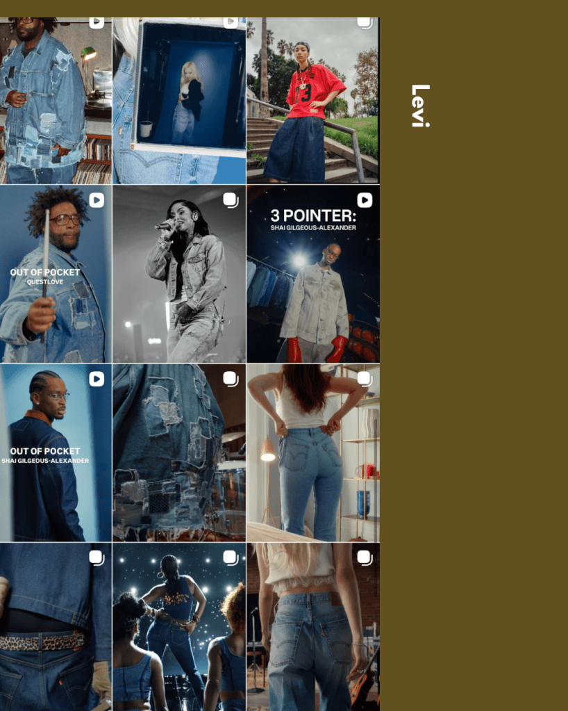 Brandmood board: it is centered around nice photography and product shoots, whether it’s Levi’s multi-ambassador campaign with SGA, Doechii to Kehlani rocking Levi’s, or Grown Alchemist showing a clean routine.