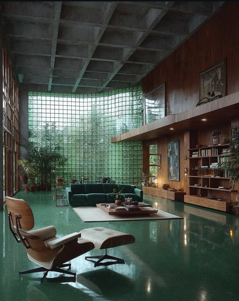 The look and feel of the house and architecture that scene match was a retro futurism take with a tile glass house. The 1950s -1970s architecture is a chic design with the glass block wall that I envision as a photoshoot or a location for inspiration for a project.