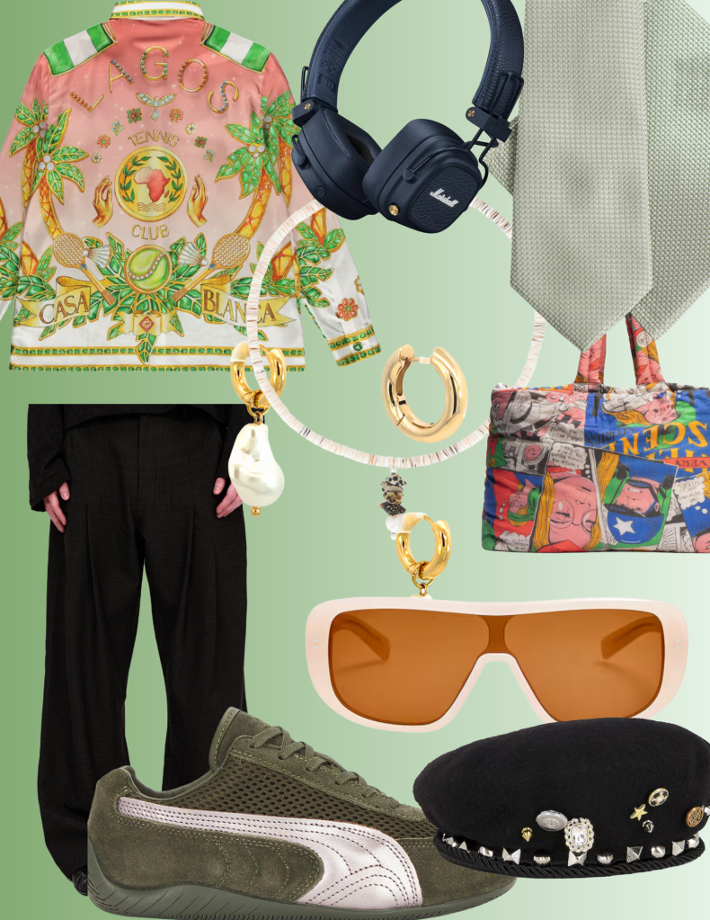 The third and final look I was centered around mixed graphics and layered beading. The Casablanca x Homecoming shirt was the center piece more than just the collaboration. Casablanca is one of few silk shirt designers that do beautiful display the mix of tropical theme and different gradients. The pants I kept simple with a wide leg trouser from uniform and a Premium Puma’s that pairs effortlessly. The shell and beading came in with the Santangleo beach shells necklace and Kody Phillips Parisian beret.